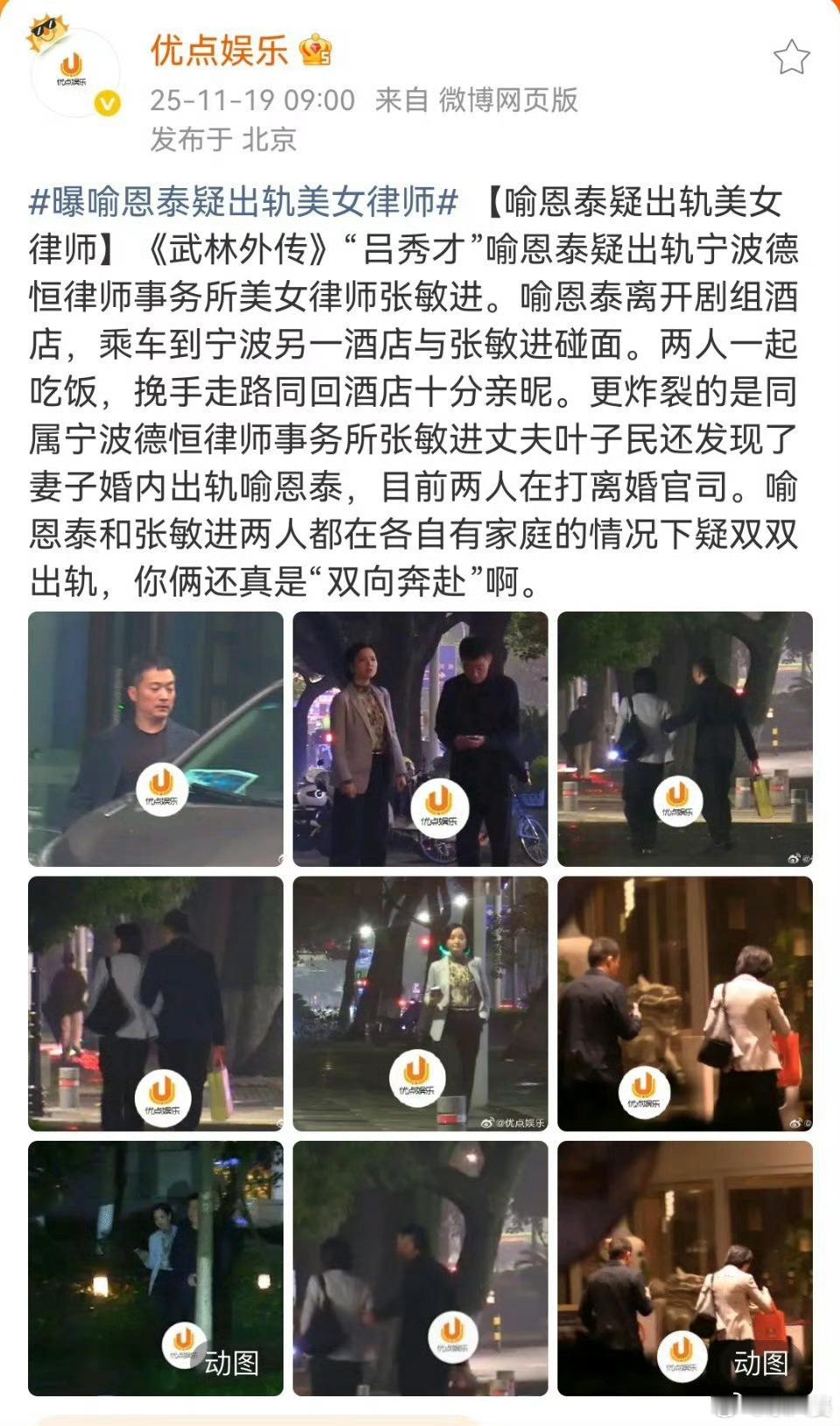 喻恩泰事件又又反转了!起初卓伟爆料喻恩泰史林子闹离婚;然后喻恩泰史林子共同好友反击指控史林子出轨;今日媒体曝光喻恩泰与律师张敏进举止亲密。娱乐圈的夫妻果然是大哥不输二哥啊……