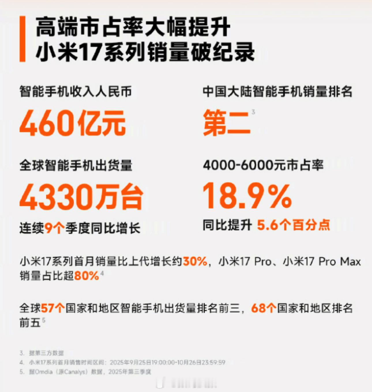 2025年第三季度,小米在中国大陆地区智能手机销量排名第二,市占率达到16.7%,实现连续6个季度排名前二。18个月都是销量第二