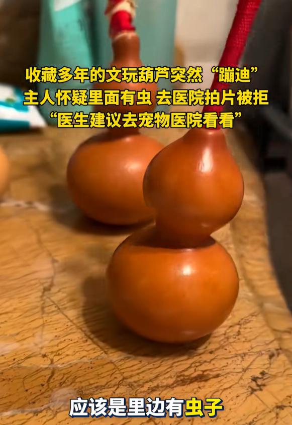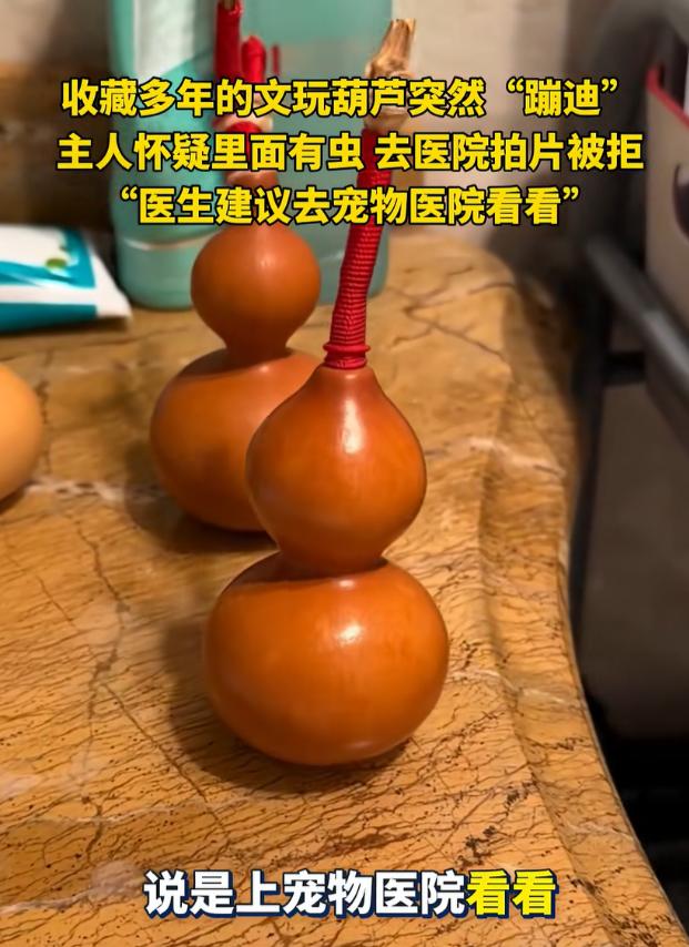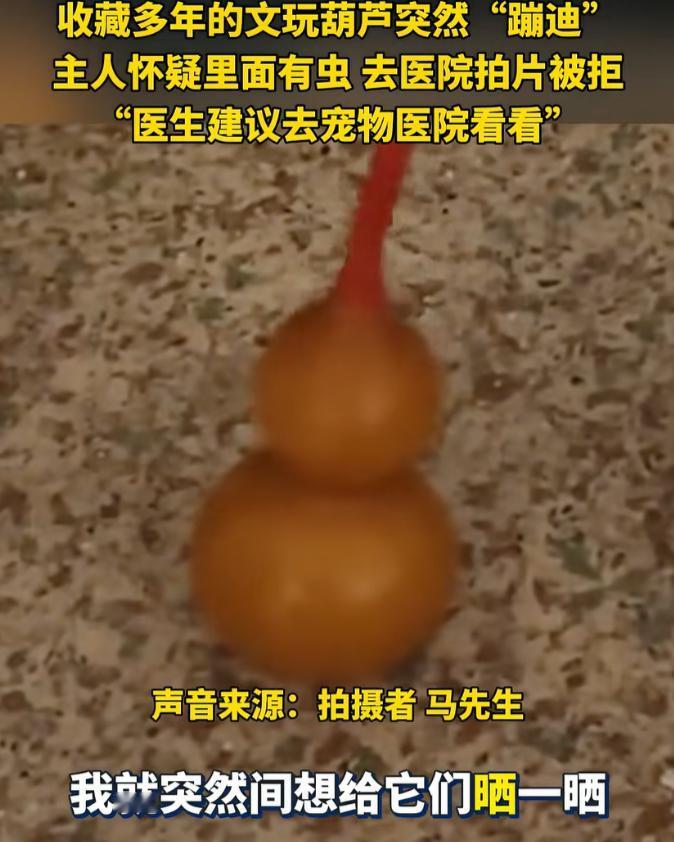 笑不活了!辽宁沈阳,一男子发现自己珍藏多年的文玩葫芦突然动了,一番找寻原因后,他怀疑里面可能是有虫子,就拿着葫芦到医院去拍片子,结果医生直接拒绝,并建议他宠物医院看看,网友:这要放走近科学节目,高低得拍3集! 辽宁沈阳最近出了桩逗乐事儿,一位马姓大哥跟珍藏多年的文玩葫芦较上了劲。 这葫芦是他的心肝宝贝,平时都小心收在木盒里,前几天天好,他想着拿出来放阳台透透气,没成想转身的功夫,就瞅见葫芦在窗台上“蹦跶”,不是风吹的那种晃,是实打实的、带着节奏的动,活像动画片里要蹦出葫芦娃的架势。 大哥第一反应是眼花,揉了揉眼睛再看,葫芦还在动,他赶紧把葫芦挪到没风的卫生间,搁洗手台上盯了半天,当天没动静,以为虚惊一场。 结果第二天一早,卫生间又传来轻微响动,那葫芦居然自顾自晃起来,持续了十多秒才停,这下发毛了,好好的葫芦没缝没洞,难不成真藏了啥东西? 琢磨来琢磨去,大哥怀疑里头生了虫子,文玩葫芦娇贵,他舍不得砸开看,突然灵机一动,医院能拍片子,给葫芦拍个CT不就啥都清楚了?说干就干,他捧着葫芦直奔医院,跟医生说明来意,等着机器“扫一扫”。 没成想医生听完直摆手,当场拒绝了,不是不给帮忙,实在是医院设备有规定,哪能给葫芦做检查? 不过医生挺热心,憋笑着给支了个招:“要不你去宠物医院问问?那儿设备或许能用上,”大哥捧着葫芦站在医院大厅,哭笑不得,折腾半天啥也没拍成,只能悻悻回家。 回家后他把这事拍了段视频发上网,配文说“葫芦自己动,医院不给拍”,立马引来了一群网友围观。 有人调侃:“这要是放《走近科学》,高低得拍三集,第一集讲‘灵异葫芦’,第二集查‘神秘异响’,第三集揭秘‘虫子在蹦迪’,”还有人出歪点子:“去地铁站过安检啊,X光一扫,里里外外看得明明白白,还不花钱。” 懂行的网友倒是给出了正经分析,文玩葫芦生虫不新鲜,多半是制作时没处理干净,葫芦里残留的果肉或者籽藏了虫卵,比如烟草甲、米象这类蛀虫的卵。 平时温度湿度合适,虫卵就孵化成幼虫,在里面啃食内壁,来回活动的时候,葫芦轻点就容易跟着晃,尤其是脐眼这些隐蔽地方,最容易藏卵,要是保存时受潮,虫子长得更快。 大哥看着评论区恍然大悟,合着自家葫芦里是住了“小房客”,他没再折腾去宠物医院,也舍不得处理掉,就把葫芦放回通风的架子上,打算静观其变。 毕竟这葫芦跟着自己多年,突然闹出这出“异动”,反倒添了份特别的纪念意义, 其实这事说起来逗,却藏着文玩收藏的小学问。 天然材质的物件难免跟自然打交道,虫卵藏在里面不稀奇,收藏前要是彻底消毒烘干,就能少不少麻烦。 不过换个角度想,这突然“蹦迪”的葫芦,可比规规矩矩的藏品多了份意外乐趣,也难怪网友们看得乐呵,现在大哥还等着看,这葫芦里的“小房客”啥时候能自己“退房”呢。