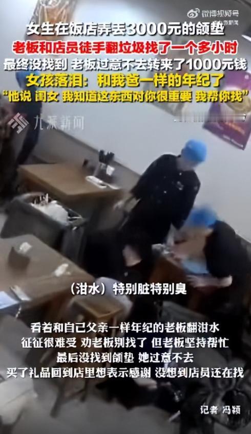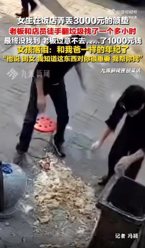 格局打开了!河南郑州,女孩去饭店吃饭时不小心把价值3000多元的颌垫弄丢了,老板看她急哭了,留下了一句“闺女,我知道这个东西对你很重要,我帮你找”,随后就带着员工翻泔水帮找一个小时,最后没找到,还给女孩转了1000块钱,给女孩都弄得不好意思了。 河南郑州的清晨,胡辣汤的香气裹着烟火气漫出小店,刚毕业的征征坐在老位置上,摘下矫正咬合的颌垫搁在桌边,吃完匆匆起身离开,等下午想起折返,桌上早没了那枚3000块定制的小东西。 这可不是普通物件,能放松咀嚼肌,重新做不仅要花钱,还得多次复诊取模,征征工资刚够糊口,丢了不敢跟家里说,扒着餐桌缝找了几遍,眼泪啪嗒掉下来。 店员们见状,没等吩咐就围过来,收银的阿姨扒拉前台抽屉,后厨的小哥掀开水池盖子,连擦桌子的抹布都抖了三遍。 在外办事的杨老板接到电话,踩着电动车往回赶,五十多岁的人,跟征征父亲年纪相仿,进门看见姑娘蹲在地上抹泪,开口就是一句:“闺女,我知道这东西对你重要,我帮你找。” 他挽起袖子直奔店外的垃圾桶,餐具早收过,东西大概率混了垃圾。 泔水桶里剩饭泡着油污,馊味钻鼻子,杨老板没找手套,直接伸手扒开黏糊糊的残渣,手指蹭得油亮。 店员们跟着上手,小姐姐捏着鼻子挑纸巾,后厨阿姨蹲在旁边分拣骨头,几双眼睛在垃圾堆里扫来扫去。 征征站在旁边,看着老板后背的汗渍,一遍遍劝“别找了,是我不小心”,杨老板只摆摆手:“再找找,说不定在。” 太阳往上爬了些,桶里的垃圾翻了个底朝天,连碎瓷片都捡出来看了,还是没见颌垫的影子。 整整一个小时,几人的袖口裤脚全沾了污渍,洗手池的水冲了好几遍还是油乎乎的,征征心里过意不去,当晚买了水果牛奶送回店里,没想到店员还在念叨“会不会掉冰柜底下了”。 更让她意外的是,手机突然弹出转账提醒,杨老板转来1000块,附言“没帮上忙,心里过意不去”。 征征赶紧退回,杨老板又转过来,电话里声音透着实在:“你一个小姑娘在外打拼不容易,这点心意别嫌少。” 后来征征把事儿发上网,网友都看暖了,有人说“徒手翻泔水的样子,比口号动人多了”,有人算过账,3000块对刚毕业的人是巨款,1000块不是赔偿,是真体恤,杨老板倒觉得平常:“她常来店里吃饭,看着孩子急,哪能不管。” 这事儿没惊天动地的情节,却戳中了人心,不是老板必须做的,也不是员工该担的责,可一句“闺女”,一双手扒垃圾,一笔转账,把陌生人的难处当成了自己的事,就像胡辣汤的热气,看着普通,喝下去暖透心口。 现在不少人怕麻烦,遇着事儿先躲,可这家小店的人用行动说明,善良从不是亏本买卖。 那桶泔水臭,可里面翻出来的善意,比什么都干净,征征说以后会常来,网友喊着要去喝胡辣汤,原来暖人心的,从来都是这些藏在烟火里的实在劲儿。