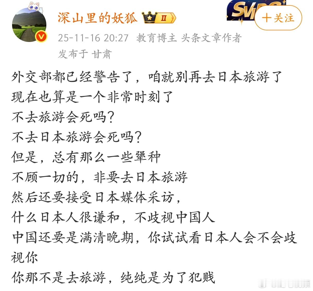 “现在去日本那不是去旅游,纯纯是为了犯贱。”