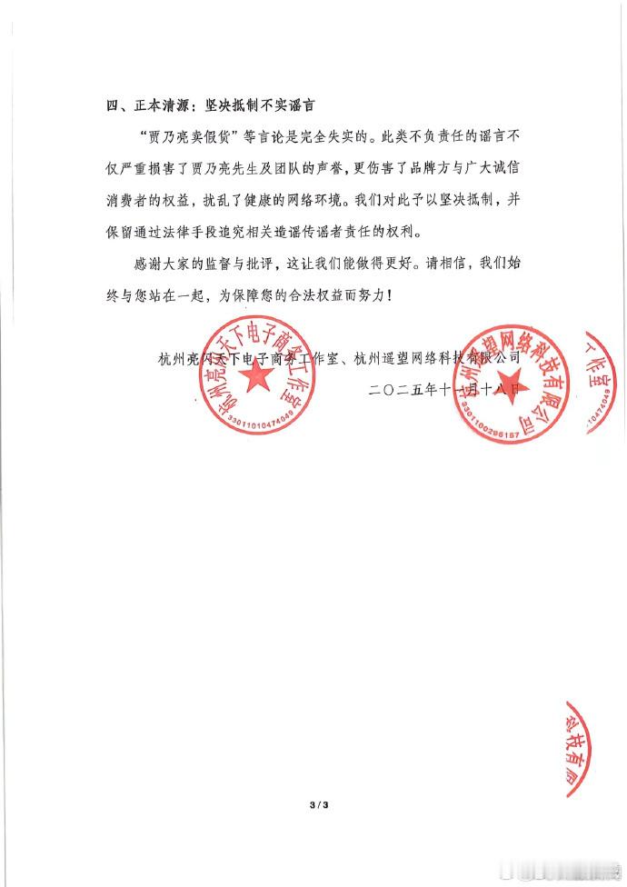 18日,贾乃亮方发布情况说明回应“贾乃亮直播间卖假货”等质疑,声明中表示货源绝对是正品,渠道官方可溯,对于相关质疑已第一时间介入,相关不实言论已严重损害了贾乃亮先生及团队的声誉,“我们对此予以坚决抵制,并保留通过法律手段追究相关造谣传谣者责任的权利”。