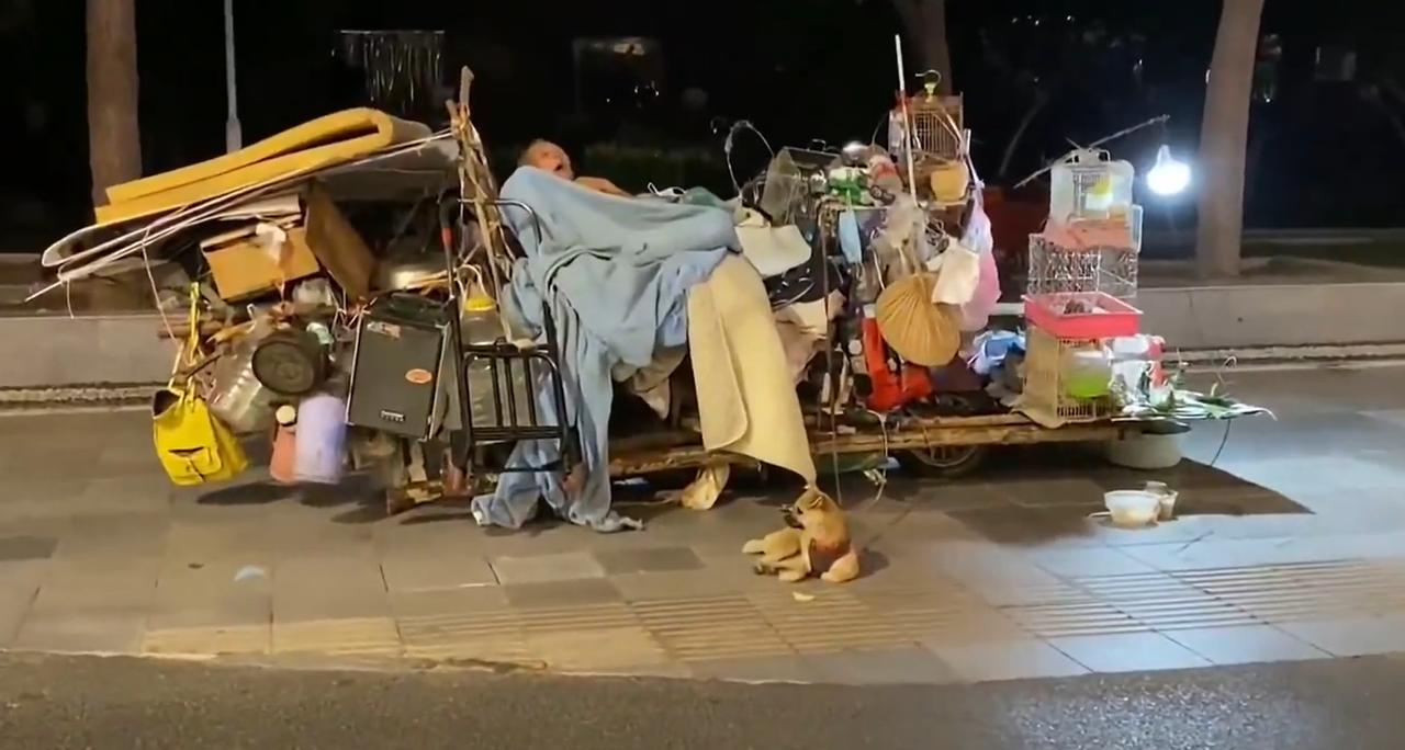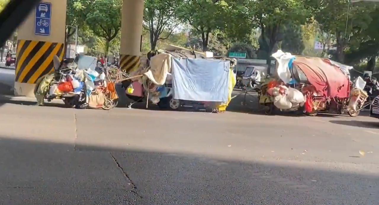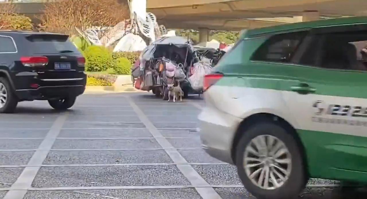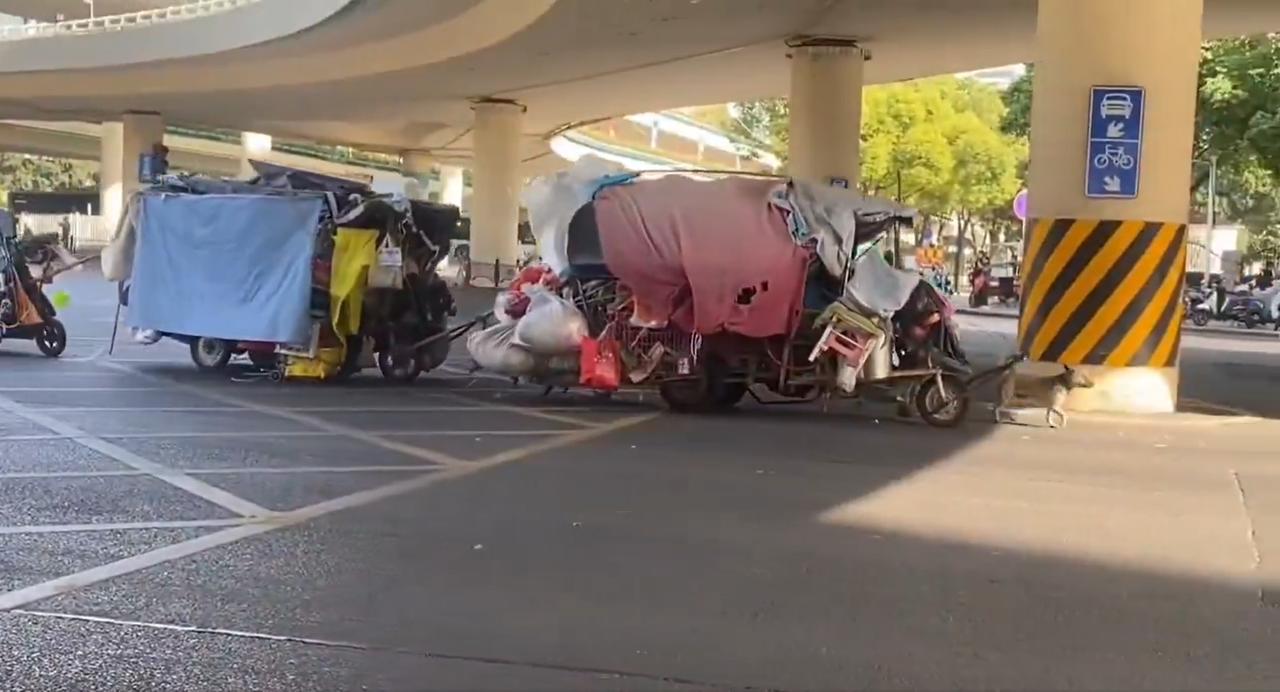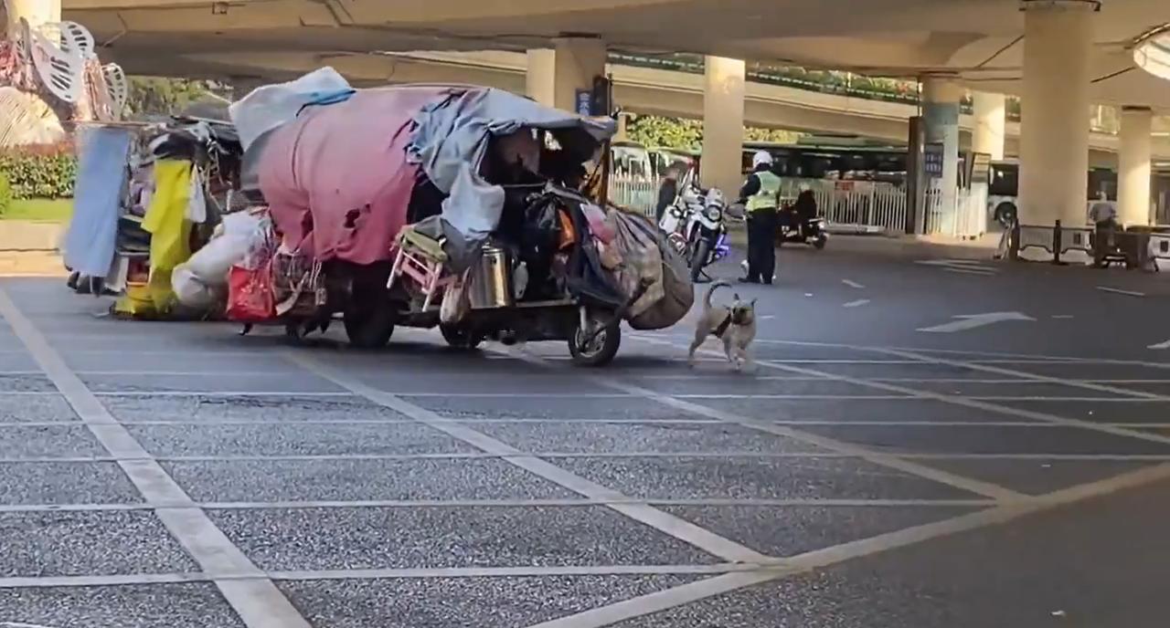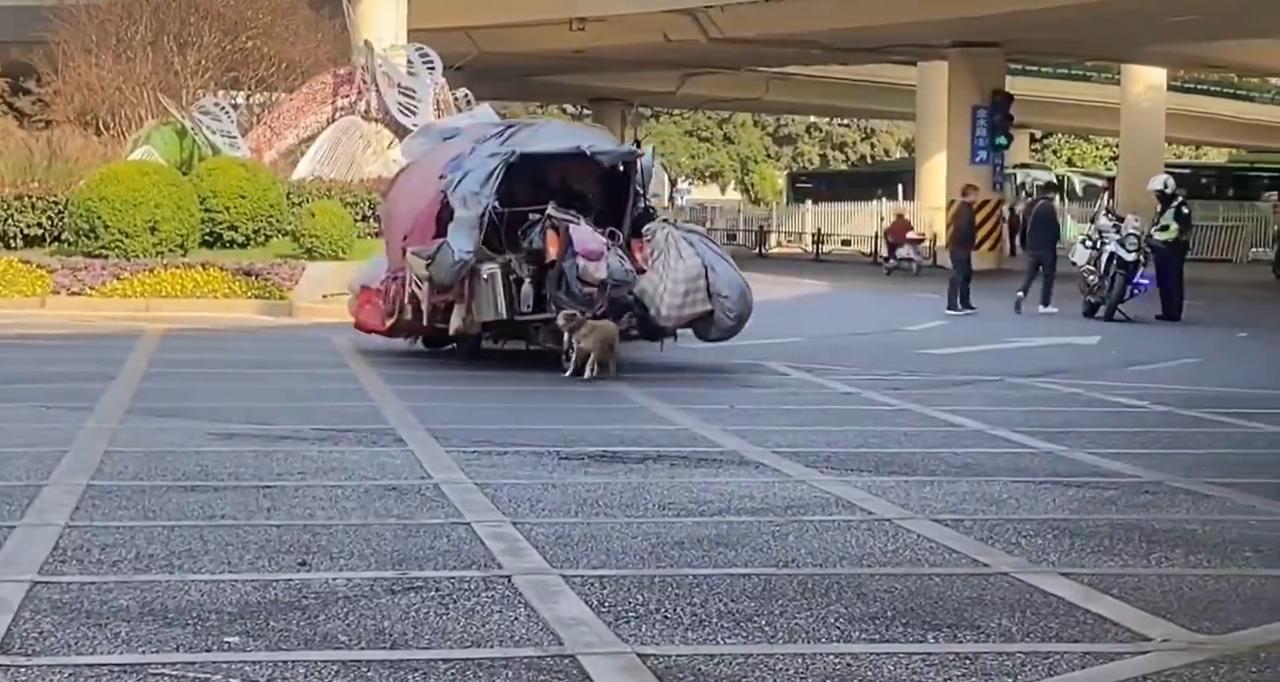河南郑州视频:一大爷拉着一辆装满杂物的电动三轮车流中行驶,前面还有一小狗跑,后面还拉着两辆装满杂物的电动三轮车,被网友戏称为“移动城之步行堡”、“火车”。这辆“火车”常出现在紫荆山立交桥附近,近十多年了,曾多次劝导甚至回来。大爷晚上就在这车上露天睡觉,一小狗在地上趴着。