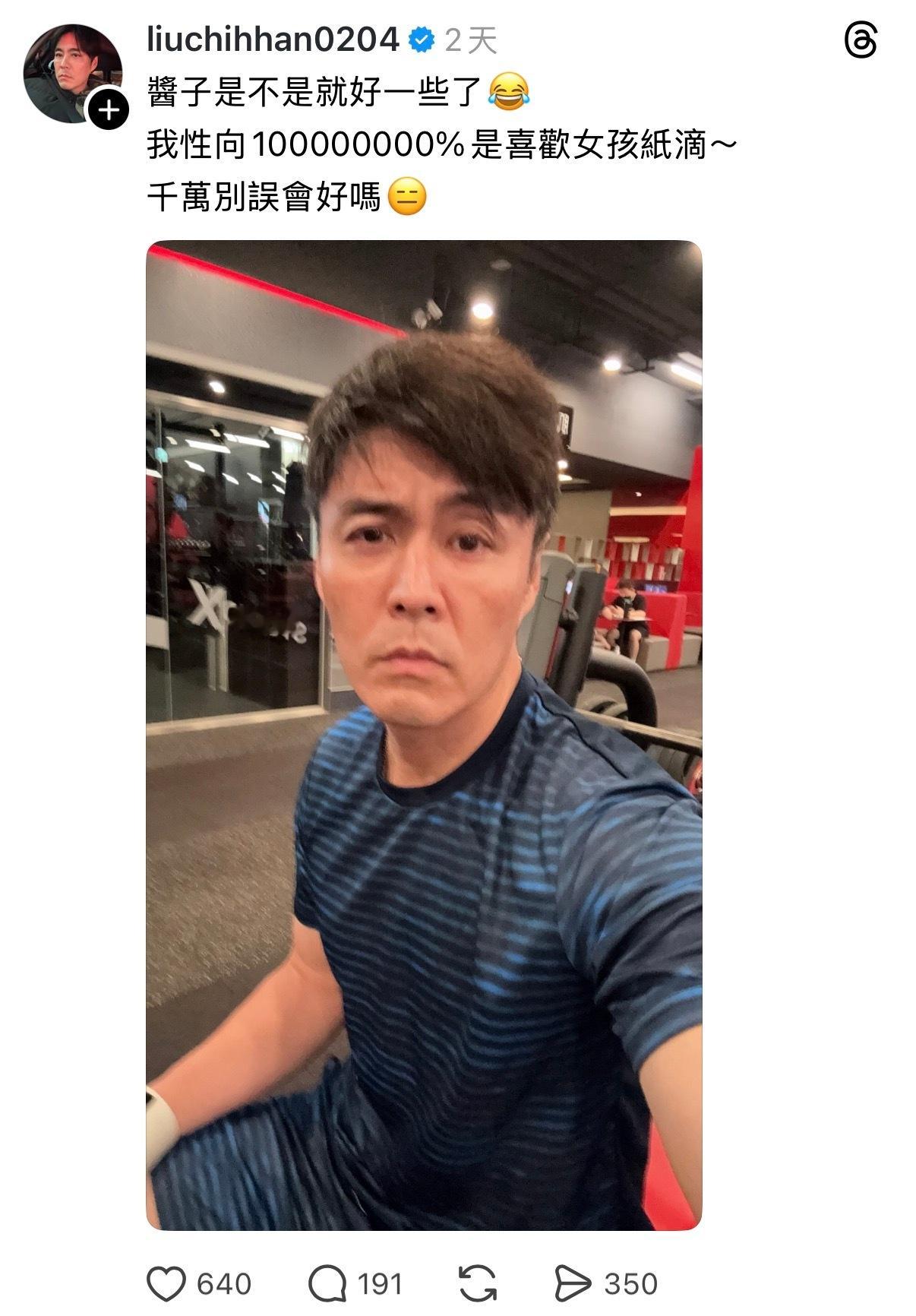 艺人刘至翰在健身房听到两个男生在讨论自己是不是g a y,于是他发文强调自己性向,希望大家别误会。