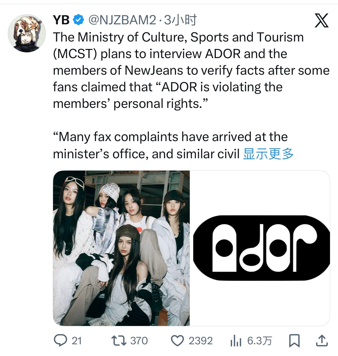 文化、体育和旅游部(MCST)计划约谈 ADOR 和 NewJeans 的成员,以核实事实,此前有粉丝声称“ADOR 侵犯了成员的个人权利”。“部长办公室收到了许多传真投诉,类似的民事投诉也通过国家请愿门户网站提交。由于这些都是正式投诉,该部将进行内部审查,并通过与相关各方面谈来核实事实。”