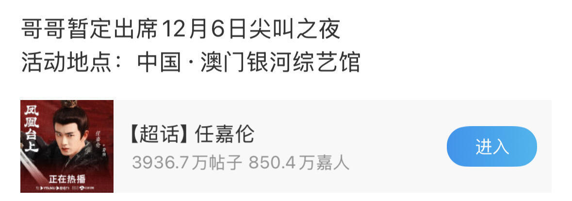任嘉伦暂定出席尖叫之夜,6号尖叫之夜7号音乐节,劳模超!