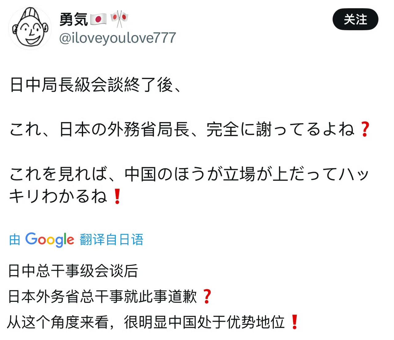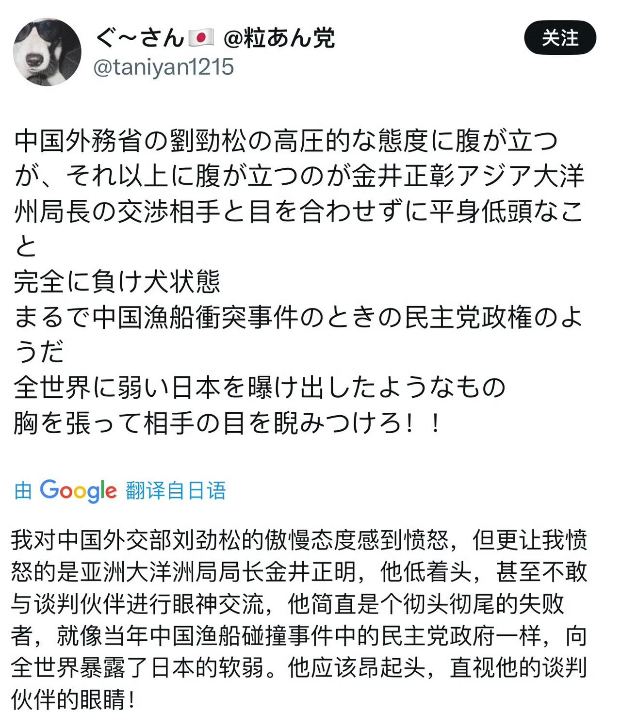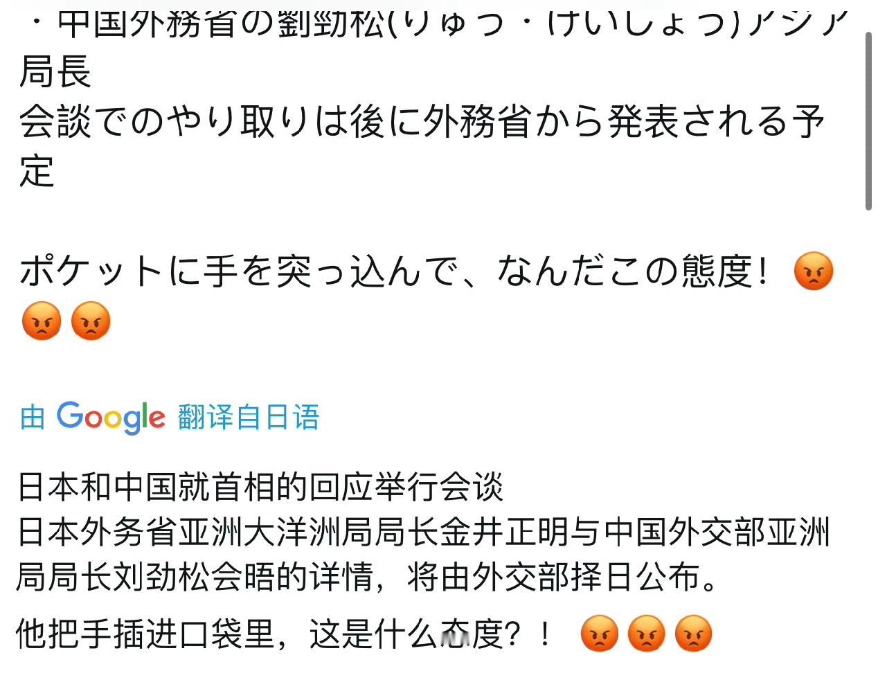 我国外交部亚洲司司长刘劲松与日本外务省亚洲大洋洲局局长金井正彰的合影照在外网爆火,日本网民大破防,纷纷抱怨金局长脸面丢尽,这不是来谈判的,是来投降的。 日本网民对金局长低头哈腰的姿态表示不理解,认为这是一种接受训话的动作,实在是有辱日本国格。 也有一些日本网民抱怨刘司长双手插兜的方式非常不尊重人,看起来相当傲慢和鄙视,让他们无法接受。 不过日本网民可能忘了,事情是你们的大当家挑起的,你们是无理方,态度谦卑一点有什么不好? 再说了,你家金局长必行目的可不是道歉,而是讨要说法,你说刘司长能给你面子吗? 要我说,刘司长没有像孙红雷那样让你跪下、手指戳头训斥“给了你机会,你不中用啊”已经是大人大量了,还有啥不满意的?