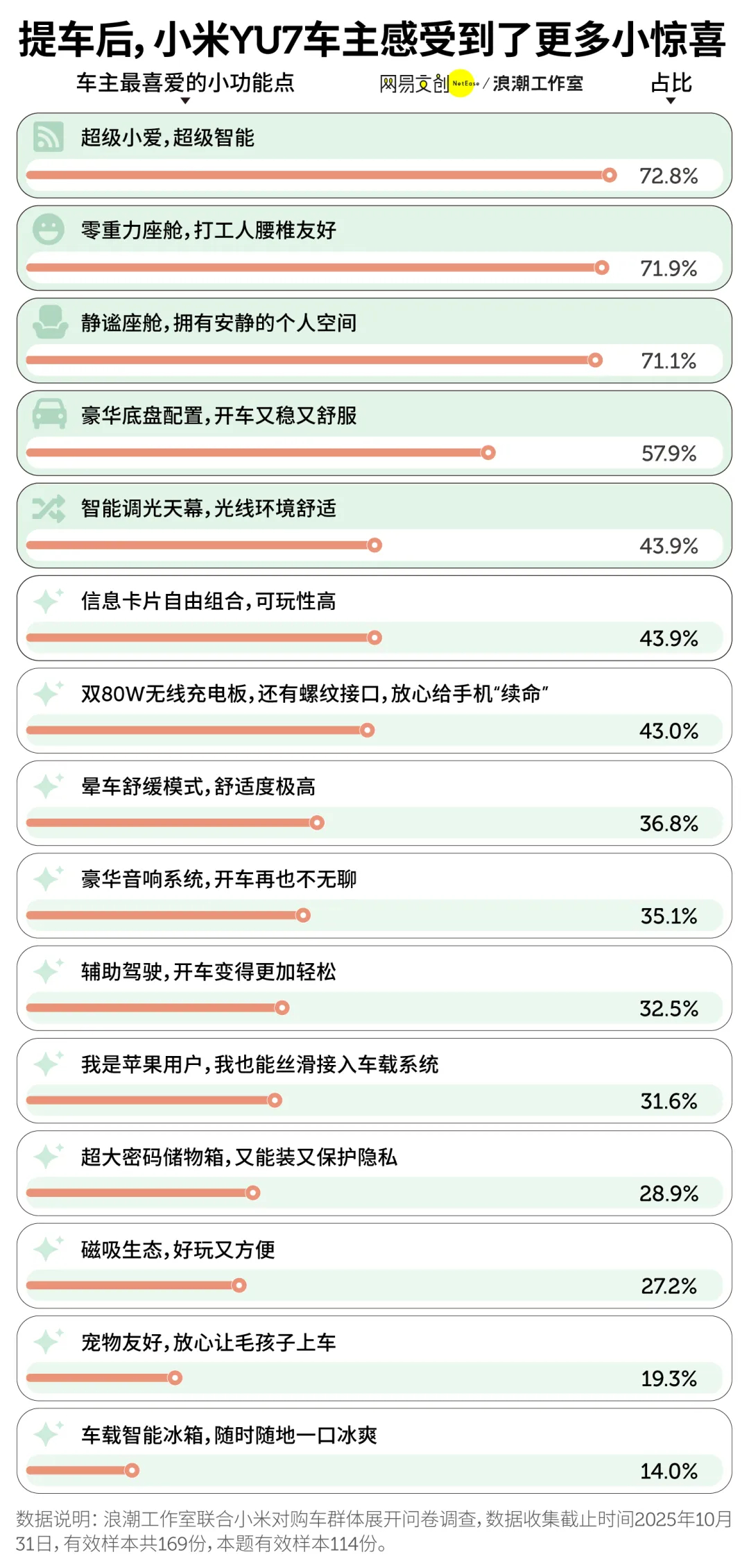 与其说年轻人愿意为小米YU7等一年,不如说目前没有类似平替的产品。因为这台车恰好长在了当代用户的审美和需求点上从最新的车主调研里,我们能看到YU7成功的真正秘密:首先是设计,看数据就能看出很多车主被优雅外观打动,在千篇一律的SUV市场中,这份独特美感,让他们愿意用等待换取不将就;其次是极致的体验,超七成车主最爱零重力座椅和静谧座舱,还有很多DIY的玩法。更有意思的是,八成车主是首次购买电车,他们跳过油车直接选择了YU7。也能看出来它的产品力打消了很多人对电动车的固有顾虑。此外,用户愿意等也是对负责任态度的认可。小米主动为延期交付兜底购置税等举措,比任何广告都更能建立信任。等待的背后也是用户对该产品优秀体验和负责任态度这三者的综合认可,所以说这才是为什么让年轻人等一年的很重要的原因
