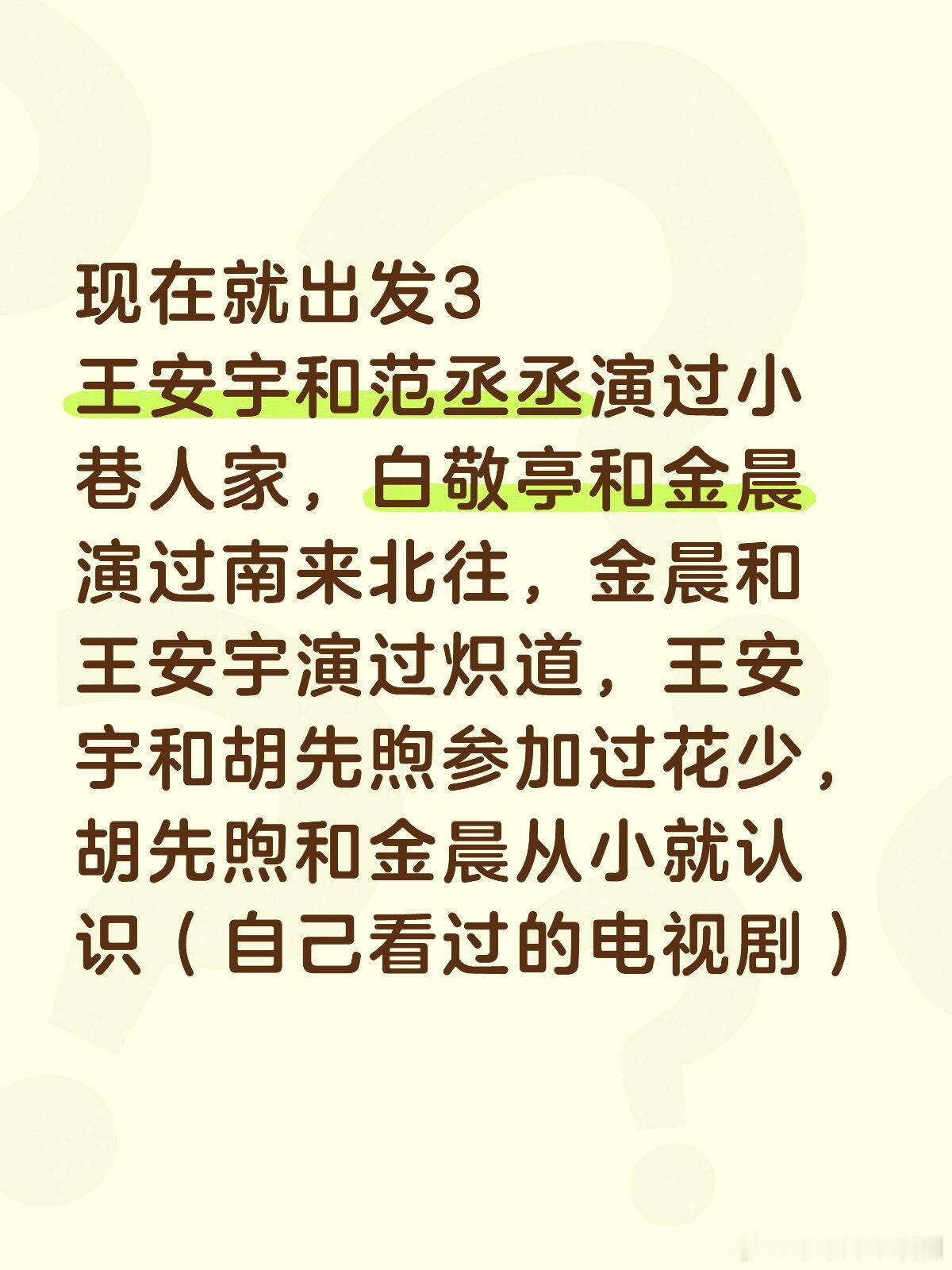 王安宇和范丞丞演过小巷人家,白敬亭和金晨演过南来北往,金晨和王安宇演过炽道,王安宇和胡先煦参加过花少胡先煦和金晨从小就认识(自己看过的电视剧)现在就出发‖王安宇‖范丞丞‖金晨‖胡先煦‖范丞丞‖