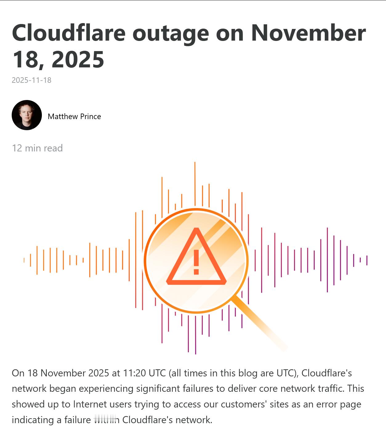 Cloudflare 官方发了该事故的复盘报告。简单来说,是Cloudflare 有一个维护着机器学习模型用来判断网络请求是否为“恶意机器人”的各项指标定义。系统每 5 分钟会对该数据库执行一次 SQL 查询,提取最新的特征列表,生成配置文件并下发到全球边缘节点,以实时更新全网的自动化威胁识别模型。Cloudflare 为了改进 ClickHouse 数据库的权限管理,调整了访问控制后,生成特征配置文件所依赖的一条元数据查询语句写错了,让特征文件中的特征数量和文件体积意外翻倍。这个超大特征文件被自动分发到全球代理节点后,触发了 Bot Management 模块中的内存预分配上限检查,加载该文件时直接 panic,导致核心代理(FL/FL2)在处理依赖该模块的请求时大量返回 5xx 错误。由于特征文件是每 5 分钟重新生成并推送一次,而且集群中只有部分分片一开始应用了权限变更,系统在一段时间内呈现“好配置”和“坏配置”交替生效的抖动状态,最终当所有节点都开始生成坏文件后,全网大范围宕掉。整个过程完全是由数据库权限变更与特征文件生成逻辑之间的隐含假设不匹配,加上配置文件大小/特征数量缺乏严格防御性校验共同触发的链式故障,而非任何外部攻击。 下面是核心部分的翻译,有兴趣的可以搜Cloudflare outage on November 18, 2025看原文。--------------------------2025年11月18日 UTC 时间 11:20(本文所有时间均为 UTC),Cloudflare 网络在传输核心网络流量时开始出现严重故障。对于试图访问我们客户网站的互联网用户来说,这表现为显示 Cloudflare 网络内部故障的错误页面。本次故障并非由网络攻击或任何形式的恶意活动直接或间接引起。相反,它是由于我们某个数据库系统的权限变更引发的,该变更导致数据库向我们的 Bot Management系统使用的“特征文件”输出了多重条目。这导致该特征文件的大小翻倍。随后,这个超出预期大小的特征文件被分发到了构成我们要网络的所有机器上。运行在这些机器上用于路由流量的软件会读取此特征文件,以保持机器人管理系统能够应对不断变化的威胁。该软件对特征文件的大小设定了一个限制,而翻倍后的文件超过了这个限制,导致软件崩溃。起初,我们曾错误地怀疑这些症状是由超大规模 DDoS 攻击引起的,但随后我们正确识别了核心问题,并停止了那个过大特征文件的传播,将其替换为该文件的早期版本。核心流量在 14:30 基本恢复正常。在接下来的几个小时里,随着流量重新涌入,我们致力于缓解网络各部分增加的负载。截至 17:06,Cloudflare 的所有系统均已恢复正常运行。对于给我们的客户以及整个互联网造成的影响,我们深表歉意。鉴于 Cloudflare 在互联网生态系统中的重要性,我们任何系统的任何中断都是不可接受的。在这段时间里,我们的网络无法路由流量,这对我们团队的每一位成员来说都是极其痛苦的。我们知道今天让大家失望了。本文将深入复盘究竟发生了什么,以及哪些系统和流程出现了故障。这也是我们为了确保此类故障不再发生而计划采取的一系列措施的开始,而非结束。------------------------------------每一个发送到 Cloudflare 的请求都会经过我们网络中一条定义明确的路径。它可能来自加载网页的浏览器、调用 API 的移动应用程序,或来自其他服务的自动化流量。这些请求首先在我们的 HTTP 和 TLS 层终止,然后流入我们的核心代理系统(我们称之为 FL,意为“前线”),最后通过 Pingora,它负责执行缓存查找或在需要时从源站获取数据。我们之前在此处分享了更多关于核心代理如何工作的细节。(图2)当请求通过核心代理传输时,我们会运行网络中可用的各种安全和性能产品。代理应用每个客户独特的配置和设置,从执行 WAF 规则和 DDoS 保护,到将流量路由到开发者平台(Developer Platform)和 R2。它是通过一组特定领域的模块来实现的,这些模块将配置和策略规则应用于通过我们代理传输的流量。其中一个模块——Bot Management(机器人管理),就是今天故障的源头。Cloudflare 的机器人管理包括一个机器学习模型(以及其他系统),我们使用该模型为通过我们网络的每个请求生成机器人评分(bot scores)。我们的客户使用机器人评分来控制允许哪些机器人访问其站点——或者拒绝哪些。该模型将“特征(feature)”配置文件作为输入。在这里,“特征”是指机器学习模型用来预测请求是否为自动化的一个独立属性。特征配置文件是各个特征的集合。该特征文件每隔几分钟刷新一次并发布到我们的整个网络,使我们能够对互联网上流量流的变化做出反应。它允许我们对新型机器人和新的机器人攻击做出反应。因此,随着恶意行为者迅速改变策略,频繁且快速地推出该文件至关重要。我们底层的 ClickHouse 查询行为发生的一个变更导致该文件包含了大量重复的“特征”行。这改变了原本固定大小的特征配置文件的大小,导致机器人模块触发错误。结果是,核心代理系统在处理我们客户的流量时,对任何依赖机器人模块的流量都返回了 HTTP 5xx 错误代码。这也影响了依赖核心代理的 Workers KV 和 Access。与此事件无关的是,我们当时正在(且目前仍在)将客户流量迁移到新版本的代理服务,内部称为 FL2。两个版本都受到了该问题的影响,尽管观察到的影响有所不同。部署在新 FL2 代理引擎上的客户观察到了 HTTP 5xx 错误。使用我们旧代理引擎(FL)的客户没有看到错误,但机器人