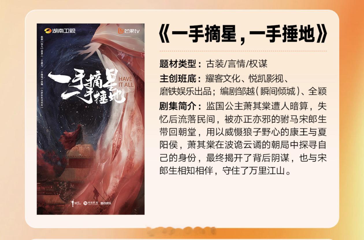 🥭新剧《一手摘星一手捶地》主演:孟子义、董思成(接触)导演:钟青根据容九同名小说改编,监国公主萧其棠遭人暗算,失忆后流落民间,被亦正亦邪的驸马宋郎生带回朝堂,用以威慑狼子野心的康王与夏阳侯,萧其棠在波诡云谲的朝局中探寻自己的身份,真相却重重反转,最终她揭开了背后的阴谋,也与宋郎生相知相伴,守住了他们所热爱的万里江山。