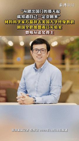 放弃美国终身教职回国!这位师从诺奖得主的科学家,早把“回国”刻进人生规划 从美国大学终身教职,到全职加盟国内实验室,材料科学家方磊的选择,藏着一份动人的家国执念。 16岁入读武大,赴美攻读博士时师从诺奖得主Fraser Stoddart,博士毕业后在斯坦福做博士后,还拿下德州农工大学终身教职……方磊的科研路本可在美一路顺遂。但他笃定地说:“从踏出国门的那天起,就知道自己一定会回来。” 如今,他回国加盟甬江实验室,担任首席研究员。国内科研生态的蓬勃发展,让他的归国之路,既是初心的回响,也是时代的召唤。这样的选择,怎能不让人由衷敬佩?