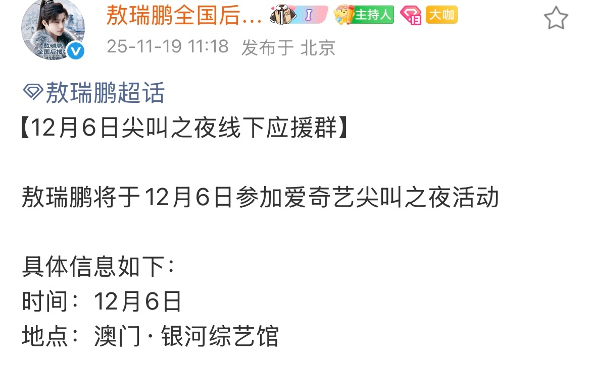 敖瑞鹏将于12月6日参加爱奇艺尖叫之夜!期待澳门见