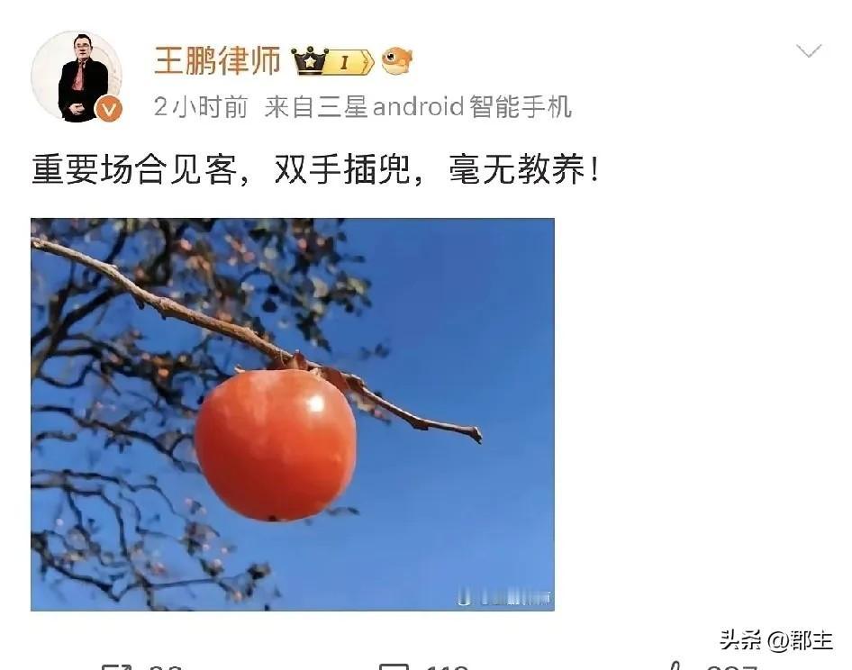 好吧!王鹏律师,你出名了,还有你的师事务所。 我想知道,这个王鹏是哪个城市的?是哪个律师事务所的律师的?什么样的律师事务所会用这样的律师? 现在这个节骨眼明目张胆的为日本说话,还配上一张有柿子的图片,就怕没有明说这是你们的“日本国旗”了吧? 这是国际交往,国际交往尤其是对刚说完“台湾有事就是日本有事”的日本人,怎么可能用日常的习惯和礼仪呢?该有的姿态和态度必须有,难道对于敌人,又是在我们的地盘,还要对它卑躬屈膝吗?外交官对于待来者不善的日本人,傲慢是他的策略,藐视是他的手段,这是向外界传达明确的信号! 何况我们伟大的左宗棠也是这样评价日本人的:“ 知小礼而无大义,拘小节而无大德,重末节而轻廉耻,畏威而不怀德,强必盗寇,弱必卑伏”。以前对它们太讲仁义道德了,所以日本不怕我们。 现在我们的外交部学会了用霸气、硬气的姿态,说对方听得懂感受得到的方式说话。毕竟我们在以礼相待,小日本还以为我拍它们。 尊重都是相互的, 王鹏律师,日本首相口出狂言你批判了吗? 我看你别叫王鹏了,把鸟去掉。