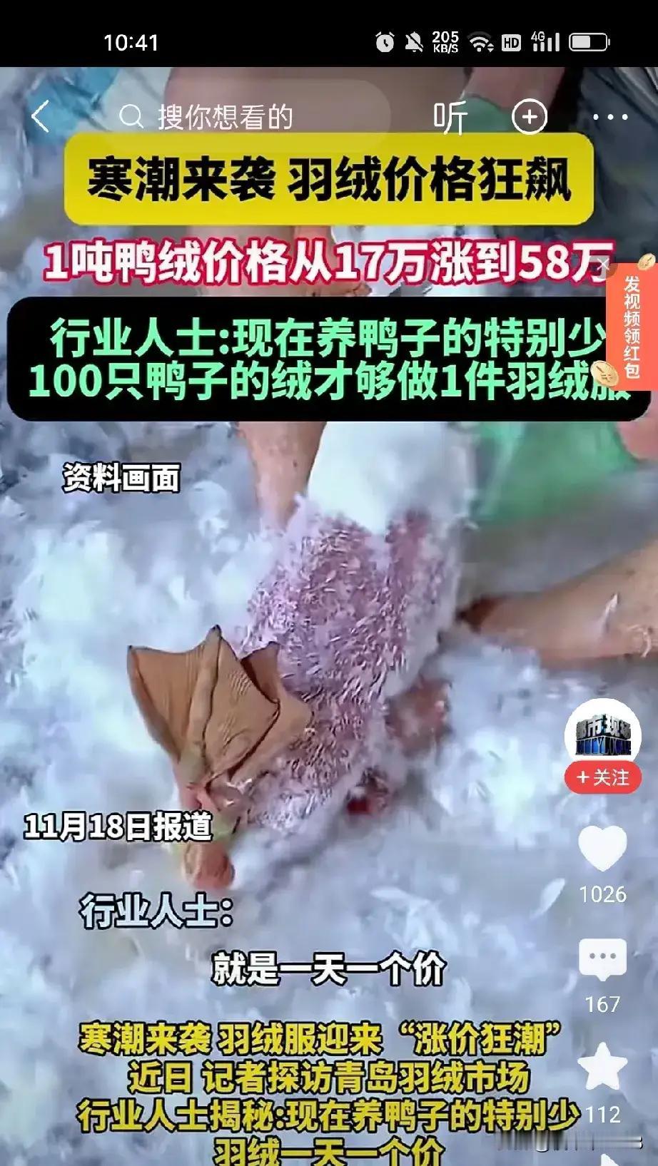 一吨鸭绒,从曾经的17万元涨到如今的58万元,背后究竟隐藏着怎样的故事?有人说,这是市场的“疯狂”,也有人觉得,这是人性与自然的碰撞。你是否曾想过,那些被我们用来温暖的羽绒,曾经是活蹦乱跳的小鸭子?它们的生命,是否值得我们每一次的取舍? 当我们在寒冷的冬日裹紧羽绒服时,是否曾思考过这些羽绒的来源?一只鸭子,为了给我们带来温暖,可能要经历怎样的折磨?它们的生命是否被无限放大成了利益的筹码?我们用金钱衡量的,是市场的供需,也是对生命的尊重。 这个价格的飙升,让我们不得不反思:我们在追求“更暖、更轻、更便宜”的同时,是否也在无意中忽略了生命的价值?每一片羽绒的背后,或许都藏着一段令人心碎的故事。我们是否还能无动于衷?还是该停下来,为这些“被冻成冰的生命”发声? 面对如此天价的鸭绒,或许我们都应该问问自己:我们真正需要的,是一件羽绒服的温暖,还是对生命的尊重与善待?这不仅仅是市场的变动,更是一次对人性良知的考验。你,准备好为这些“被冻成冰的生命”发声了吗?