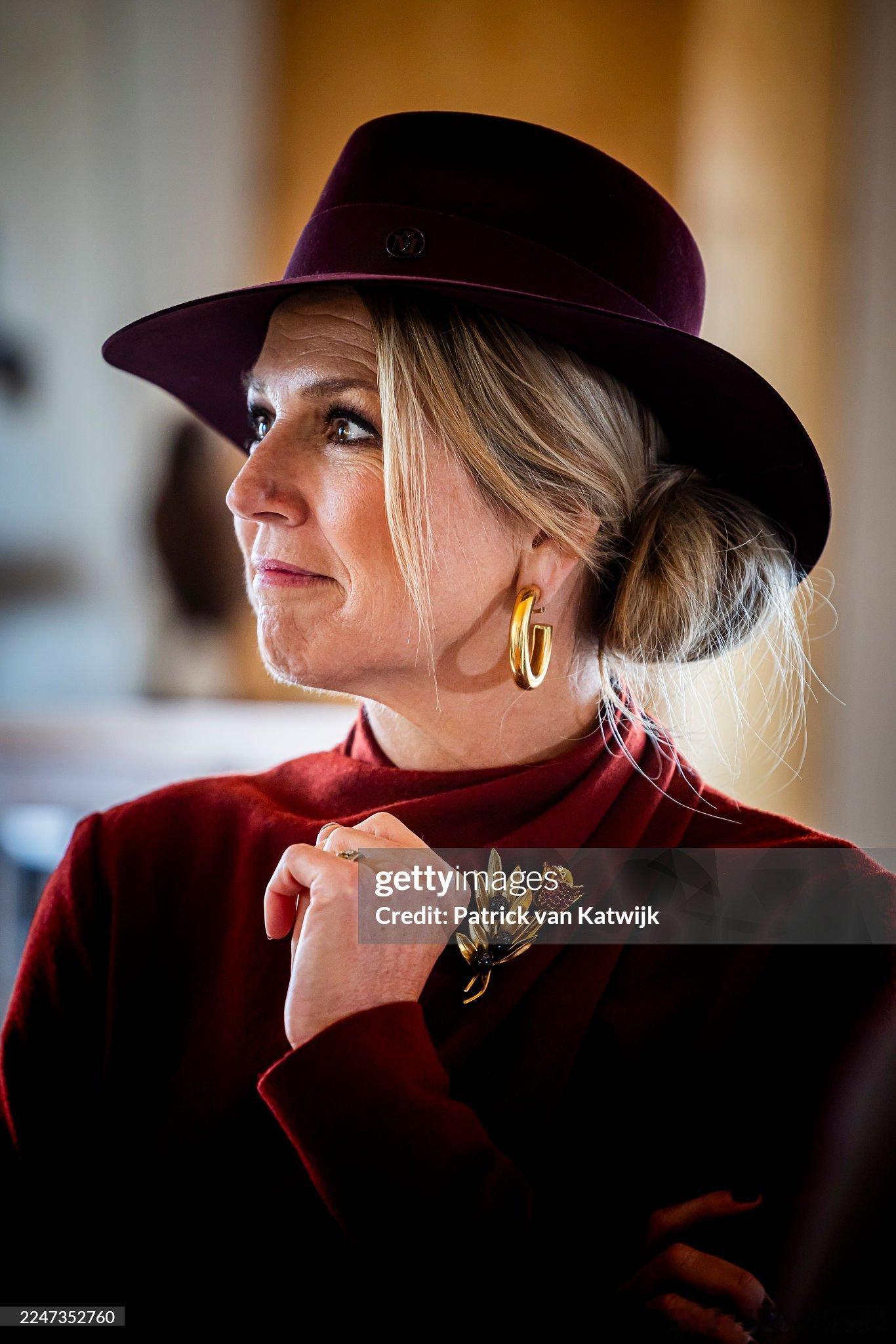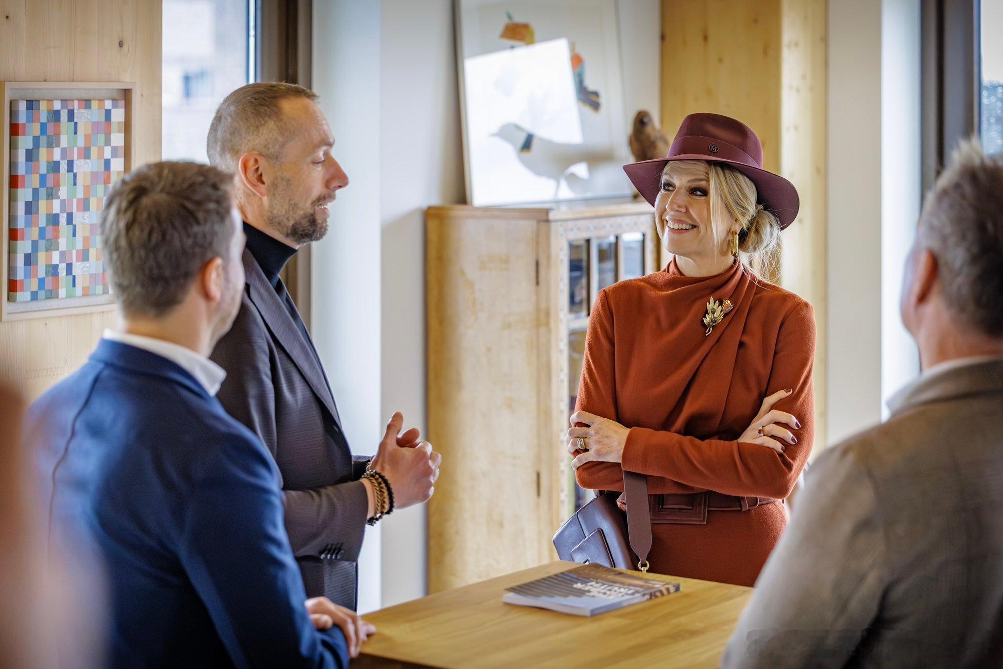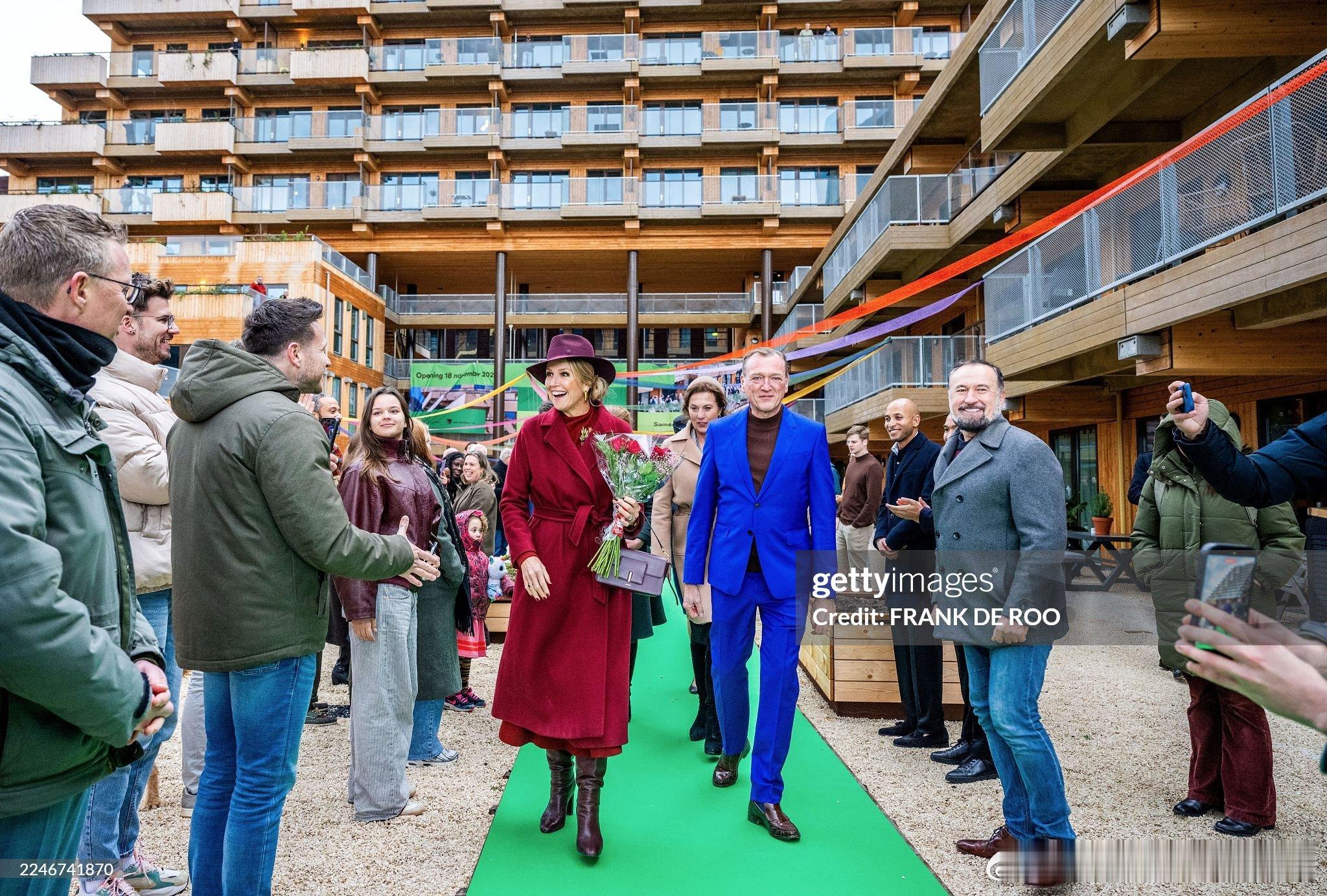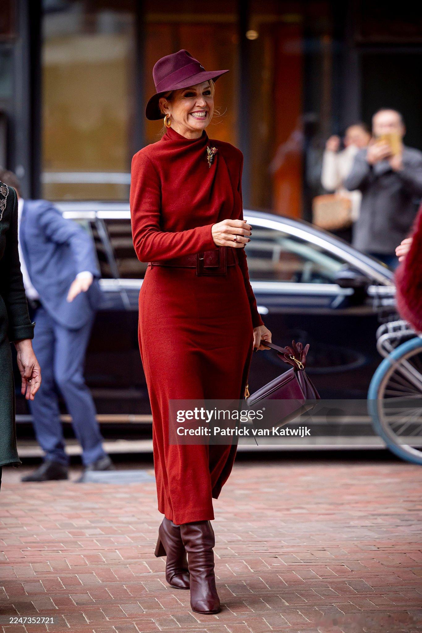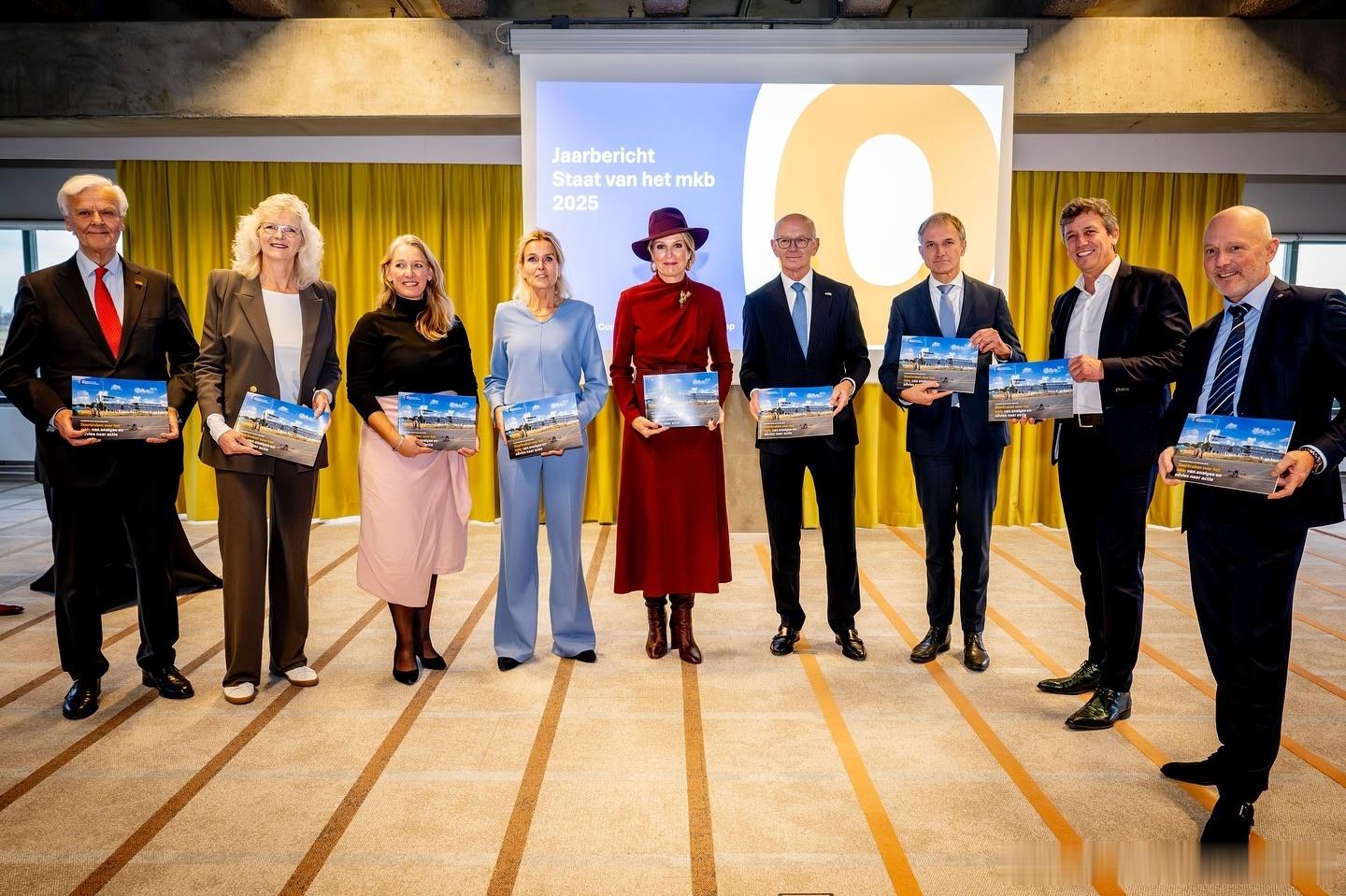 2025.11.18 荷兰王后玛克西玛出席两个公务,分别在鹿特丹为环保圆形木结构住宅楼SAWA揭幕以及出席荷兰创业委员会发布的年度报告《2025年中小企业状况》会议,旧红色大衣和连衣裙分别来自Max Mara和Natan,穿红色好看的。