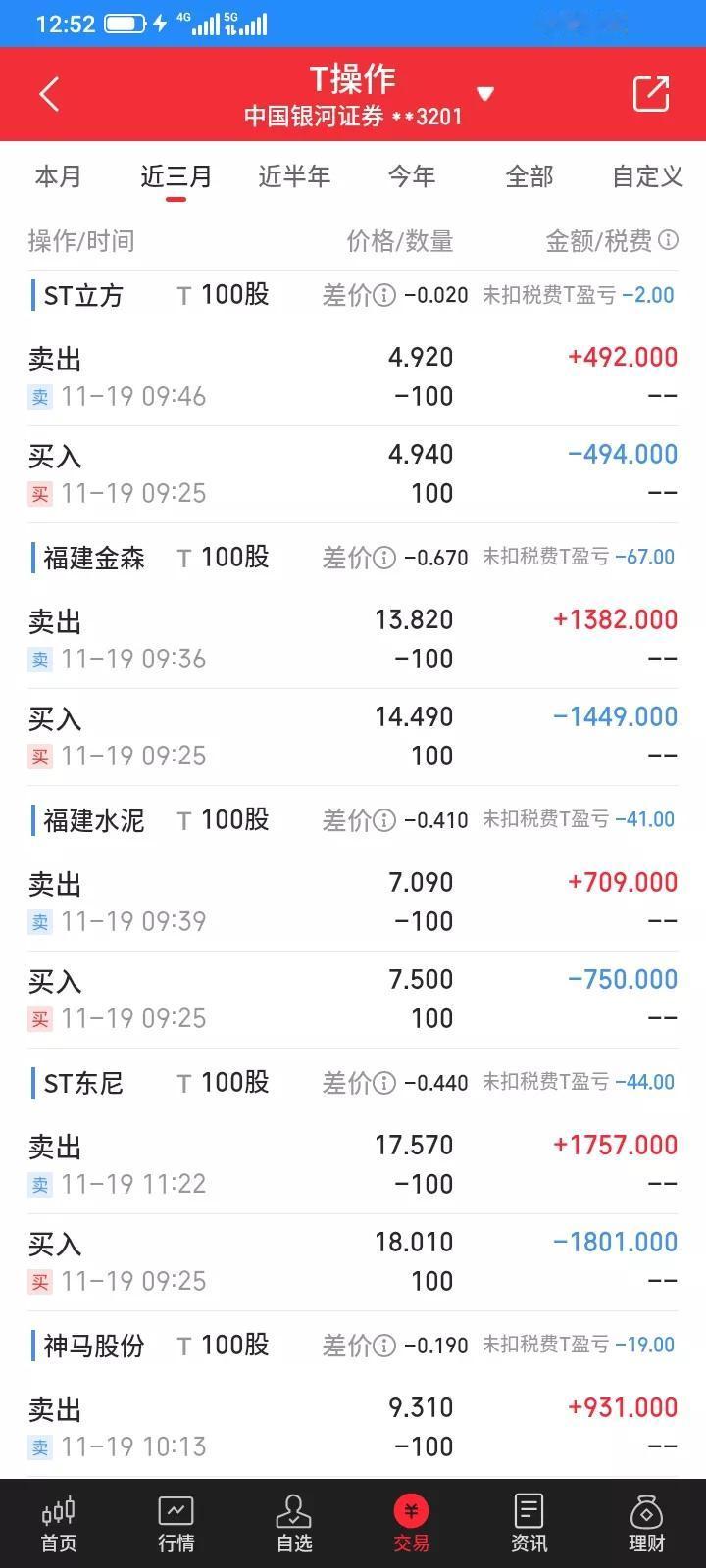 2025.11.19,今天做t又都失败了,又多亏了一百多块钱了,还有些等到下午再结算吧。早上开盘买入了十多只股票,大部分做t失败 ,还有些失败了,但是还想扛一扛,等收盘再和庄家比大小吧,再开牌,再结算。当然亏了也是要愿赌服输的。感觉做t也是要看大环境 大环境好的时候,做t成功率才高,赚钱才多,现在的环境不适合做t,但是管不住手,总想买。