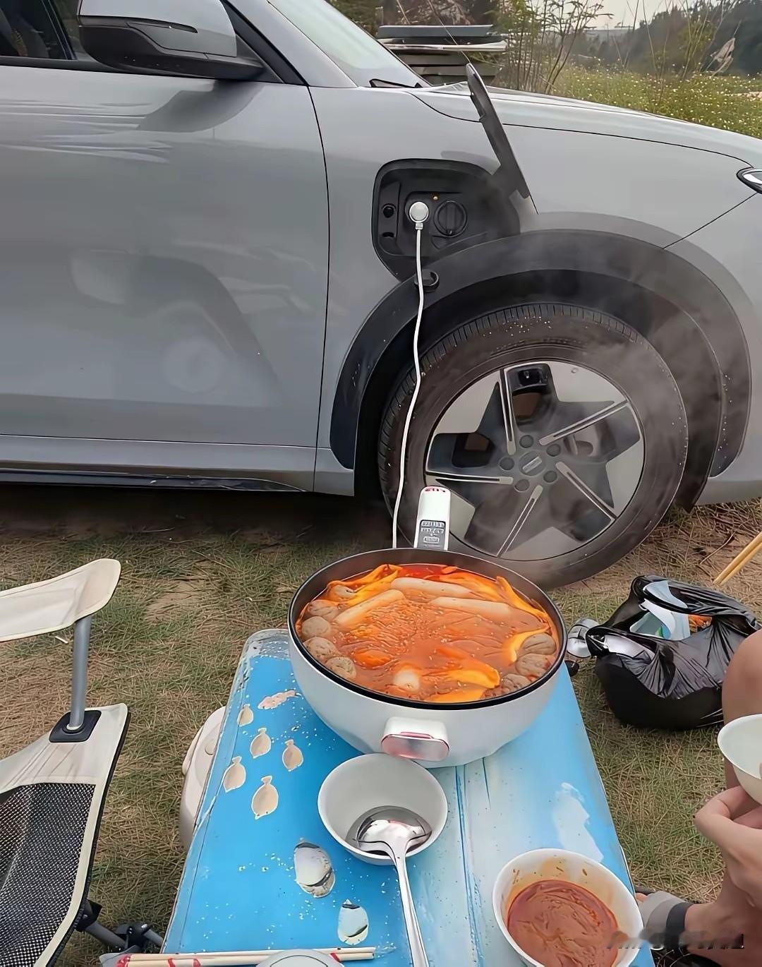 燃油车的天塌了!没想到电车省油还可以做饭,看到新能源车主在野外露营,不仅可以炒菜做饭,还能吃火锅,燃油车估计想马上回去换新能源车了!