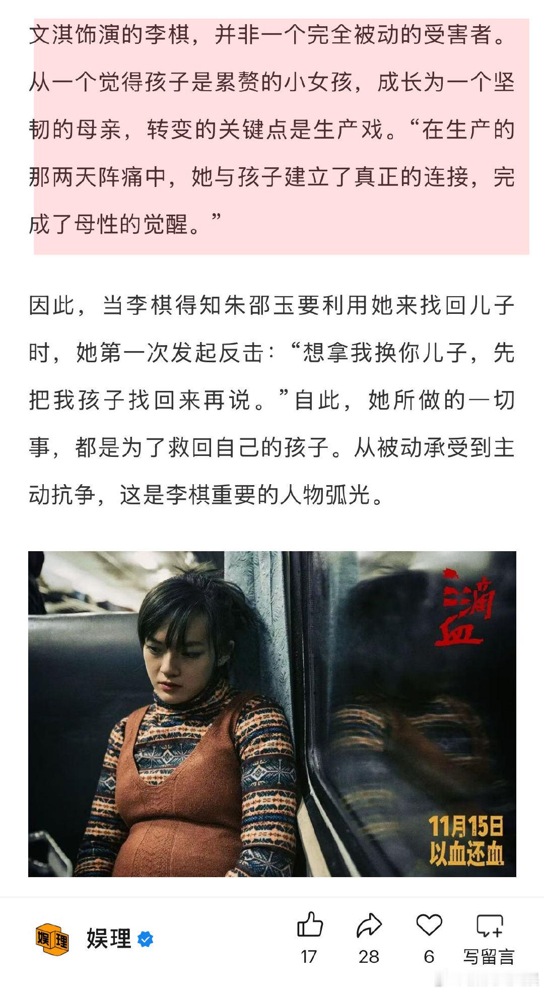 谈及文淇饰演的李棋,《三滴血》导演康博认为这个人物转变的关键是生产戏。“在生产的那两天阵痛中,她与孩子建立了真正的连接,完成了母性的觉醒。”当李棋得知朱邵玉要利用她来找回儿子时,她第一次发起反击。自此,她所做的一切事,都是为了救回自己的孩子。从被动承受到主动抗争,这是李棋重要的人物弧光。↓
