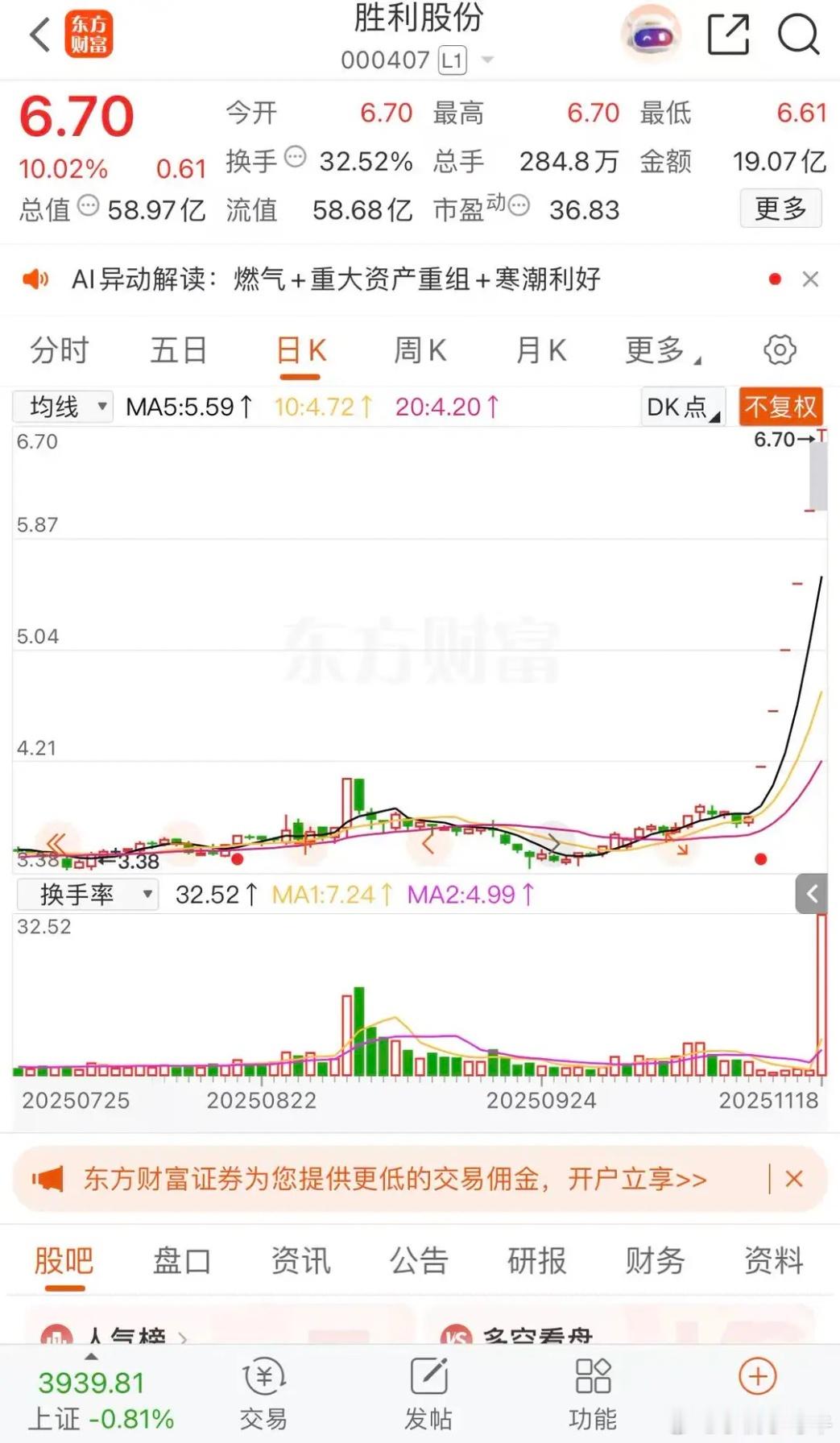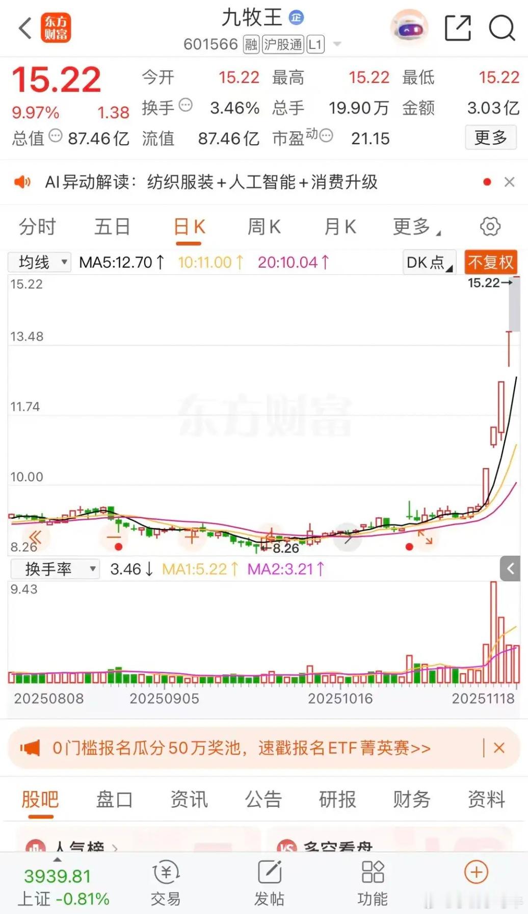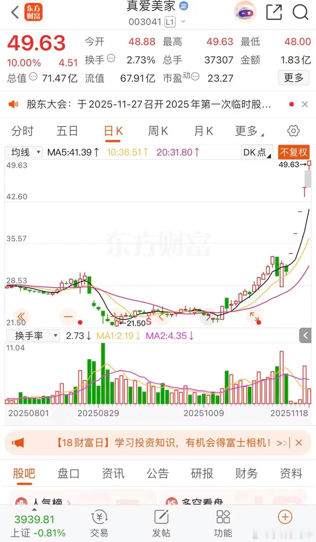 大哥不在二哥顶上,真爱美家,胜利股份,九牧王真爱美家涨停板收盘报收49.63元每股,成交金额1.83亿元,明天突破历史高价50.52元每股,今日涨停已经连续5板。九牧王涨停板收盘报收15.22元每股,成交金3.03亿元,今日一字板牢牢守住涨停板,大哥平潭发展不在,二哥顶上。胜利股份涨停板收盘报收6.70元每股,成交金额放大到19.07亿元,6天涨停板,还能持续多久,今天换庄,看看老庄给不给面子。沪指报收3939.81点
