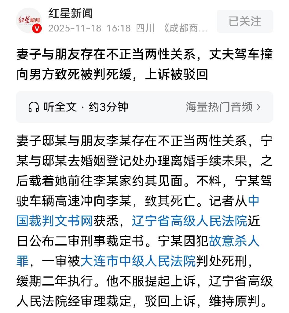 辽宁大连,男子发现妻子跟朋友存在不正当关系,十分愤怒,在跟妻子离婚未果后,约见了朋友。看到朋友出门后,男子驾驶轿车朝朋友撞去。朋友躲闪不及被撞死,事后,法院这样处理男子。 平时我们坐在轿车里,这也就是个代步工具,车窗外可能是清晨街边冒着热气的早点摊,或者是为了生计忙碌的铝锅蒸腾出的烟火气。 但就在2023年7月21日那个上午,这层日常的温情面纱被彻底撕碎,原本象征家庭资产的私家车,异化成了剥夺生命的凶器。 那天上午9点45分左右,李某在接到一通电话后走出了家门。他在门口大概只站了两分钟,没成想这是生命的最后时刻。 早已在附近蹲守的宁某没有踩下刹车,而是轰踩油门撞了过去,这不是什么交通意外,因为当李某本能地向南侧躲避时,宁某甚至精准地调整了方向盘再次冲撞。 法医鉴定的结果惨不忍睹,短短半秒钟的决断,造成的后果是受害者颅脑严重损伤、心脏破裂以及肝脏粉碎性破裂出血。 这起发生在金普新区某处路边的惨剧,把这种驾驶工具杀人的极端性展现得淋漓尽致,这完全跨越了交通肇事的界限,是被愤怒接管的故意杀人。 说来讽刺,就在案发前不到两个小时,也就是当天早上8点多,宁某和妻子邸某还心平气和地出现在婚姻登记处。 那里的走廊空荡荡的,只能听到空调运转发出的单调嗡嗡声,他们本想给这段摇摇欲坠的婚姻画上句号,但制度性的“拦路虎”出现了。 因为离婚冷静期的规定,工作人员告知当天办不了手续,这本来是一个旨在挽救婚姻的善意设置,但在那个当下,却产生了一种奇怪的化学反应,宁某当场扔下一句“不离了”转身离开,这并不是感情的回温,反倒像是一个极其危险的情绪信号。 从登记处出来到抵达受害者家这段路程,成了真正的“情绪真空期”,行政手段可以让人“冷静”无法立刻领证,但它没法给当事人暴走的心态装上刹车。 就在车内沉默压抑的空气中,原本合法的婚姻关系虽然被“保住”了,理智却彻底崩塌,最终将怒火烧向了作为第三者的李某。 案件审理过程中,大连市中级人民法院的一审判决是死刑,缓期二年执行,并剥夺政治权利终身,后续虽然有人不服提起上诉,但辽宁省高级人民法院依然驳回上诉,维持了原判,这个量刑结果,其实是在两个极端的法理天平上找平衡。 为什么要判死缓而不是立即执行?关键点在于“事出有因”,虽然《民法典》里的夫妻忠实义务不是刑法,但在量刑时法院不得不考虑,被害人李某与宁某的妻子确实存在不正当关系,按照相关指导意见,这种因为民间矛盾激化、且被害人方有明显过错的情况,通常不一定要极刑处决。 我们看最高法今年发布的数据,严重暴力犯罪在过去十年里整体下降了近三成,但像宁某这样利用车辆泄愤的个案,依然触目惊心。 不管是对比浙江瑞安那个撞击并殴打情夫判无期的田某,还是还没审完的凉山男子推妻下楼案,逻辑都是相似的:手段极其残忍,性质必须严惩。 那个上午的终局令人唏嘘,案发后,宁某虽然开车去了派出所投案,中间还因为心脏不适转去了医院,最终在当天中午12点被警方正式传唤归案,而妻子邸某下车拨打了120和110,眼看着情人倒在柏油路边的土路上。 法律的判决不管多么公正,也无法像那个冷静期原本期望的那样修补任何关系,它只负责在这一地鸡毛的悲剧收场后,给出一个不得不给的交代,那一刻的方向盘一旦打偏,没有任何后悔药可吃,留下的只有两个破碎的家庭和无法挽回的命债。