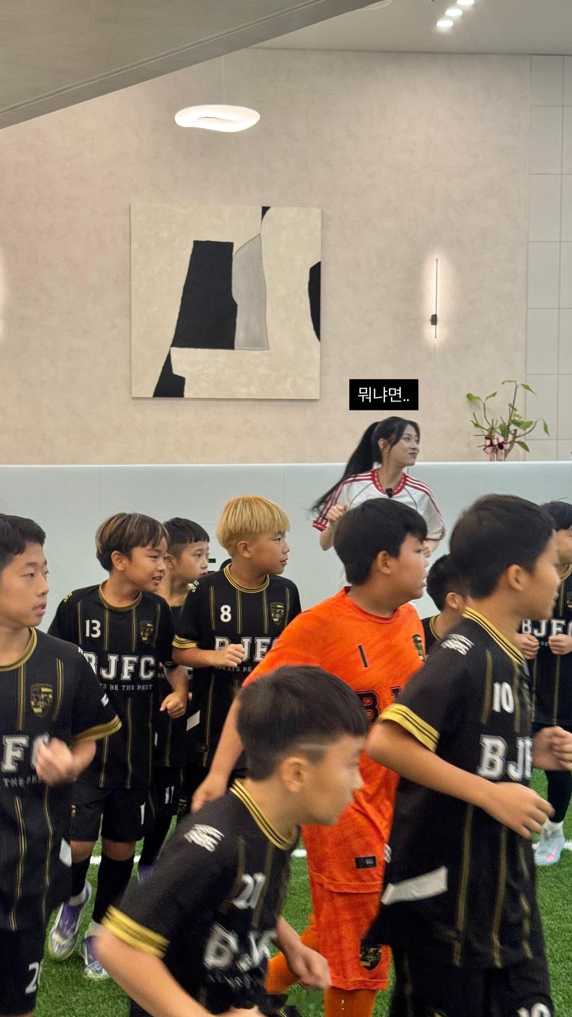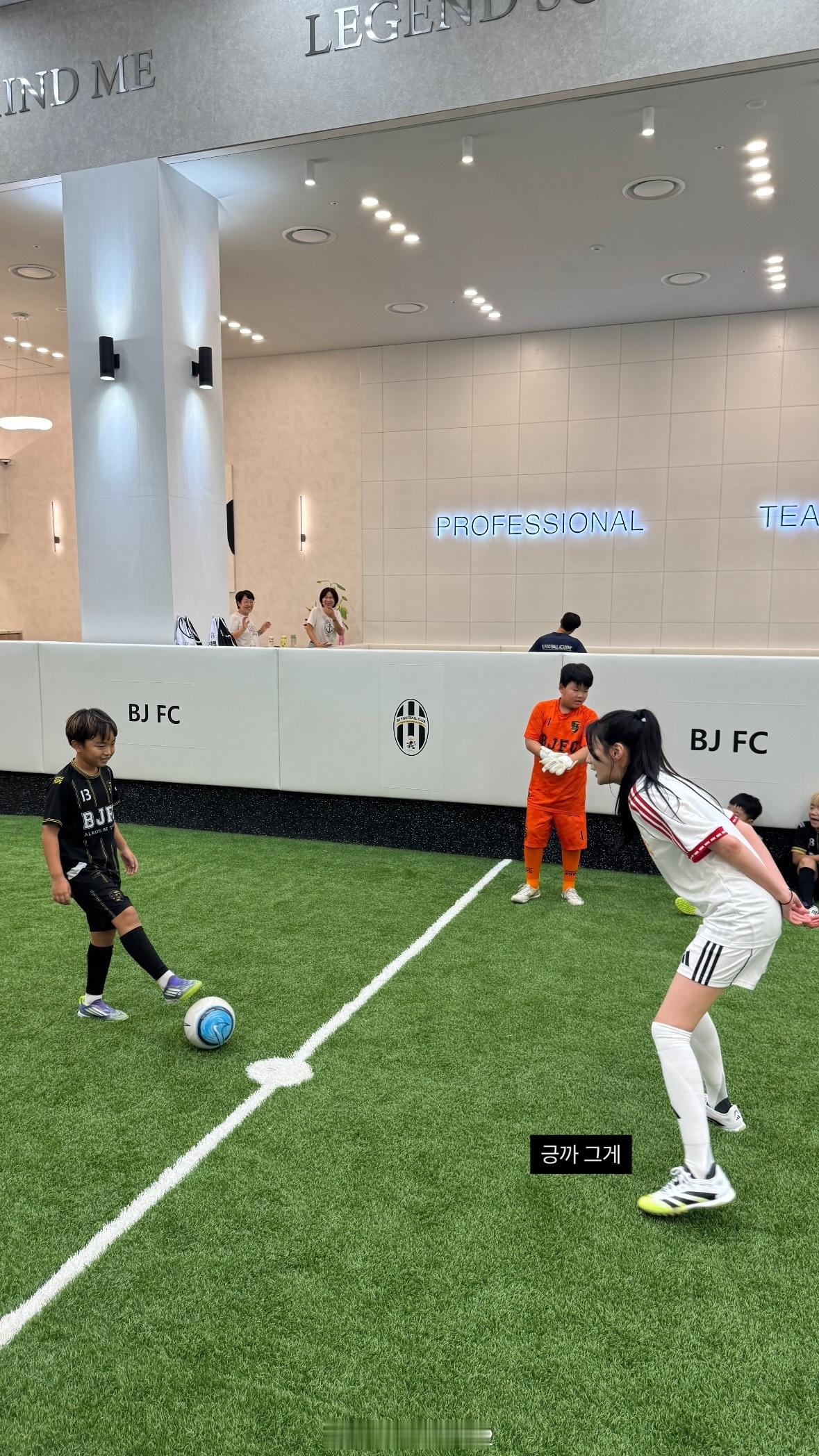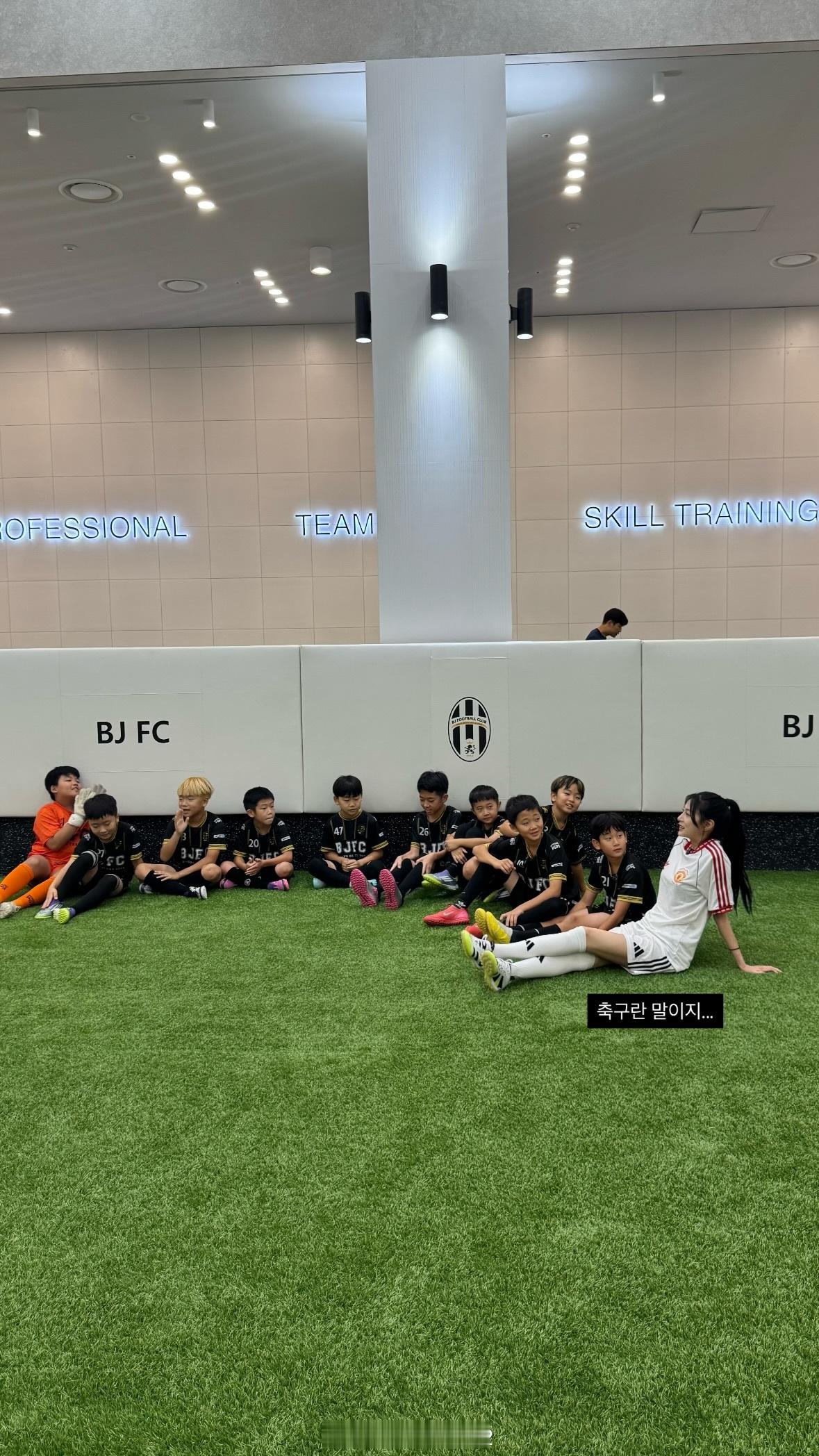 身穿曼联球衣和小朋友们一起训练的足球插班生吴夏荣。