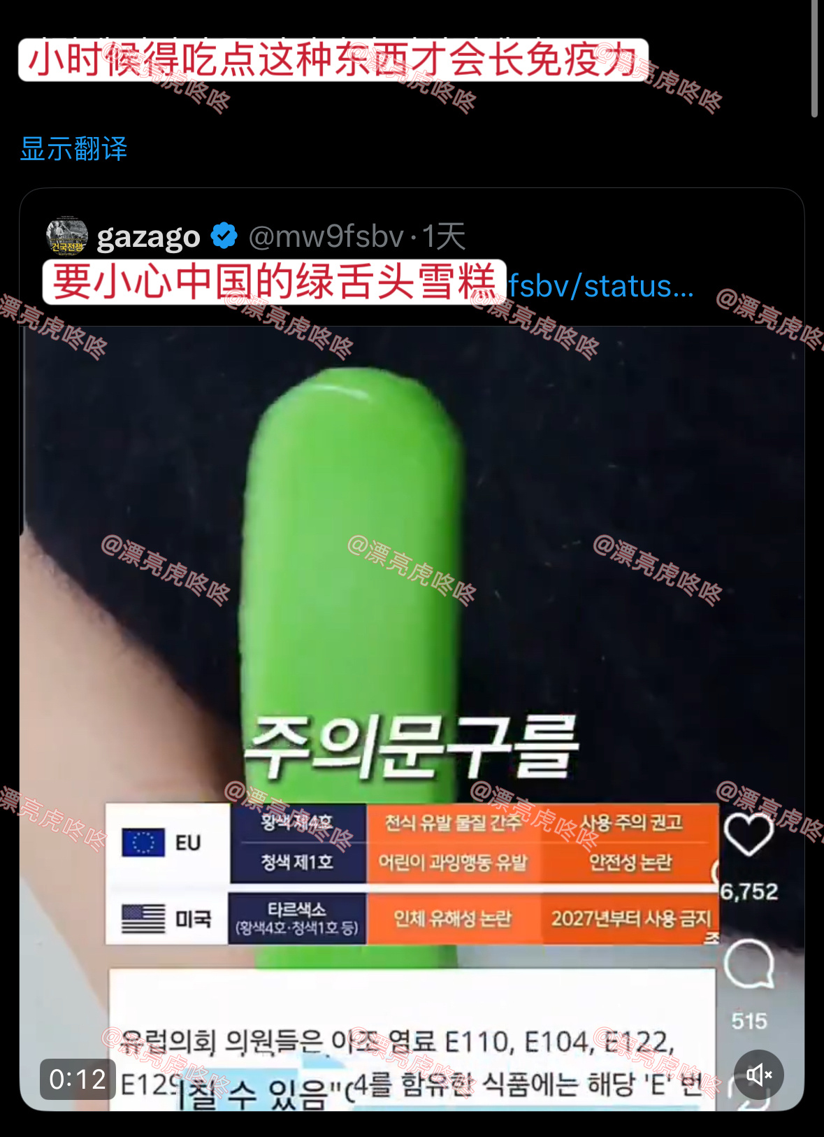 【twi】韩网呼吁小心中国的“绿舌头”雪糕热转:“小时候得吃点这种东西才会长免疫