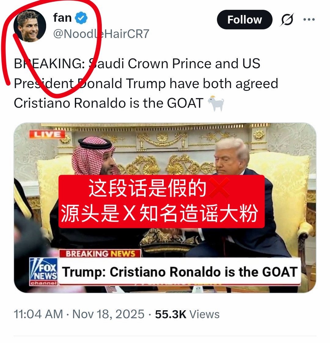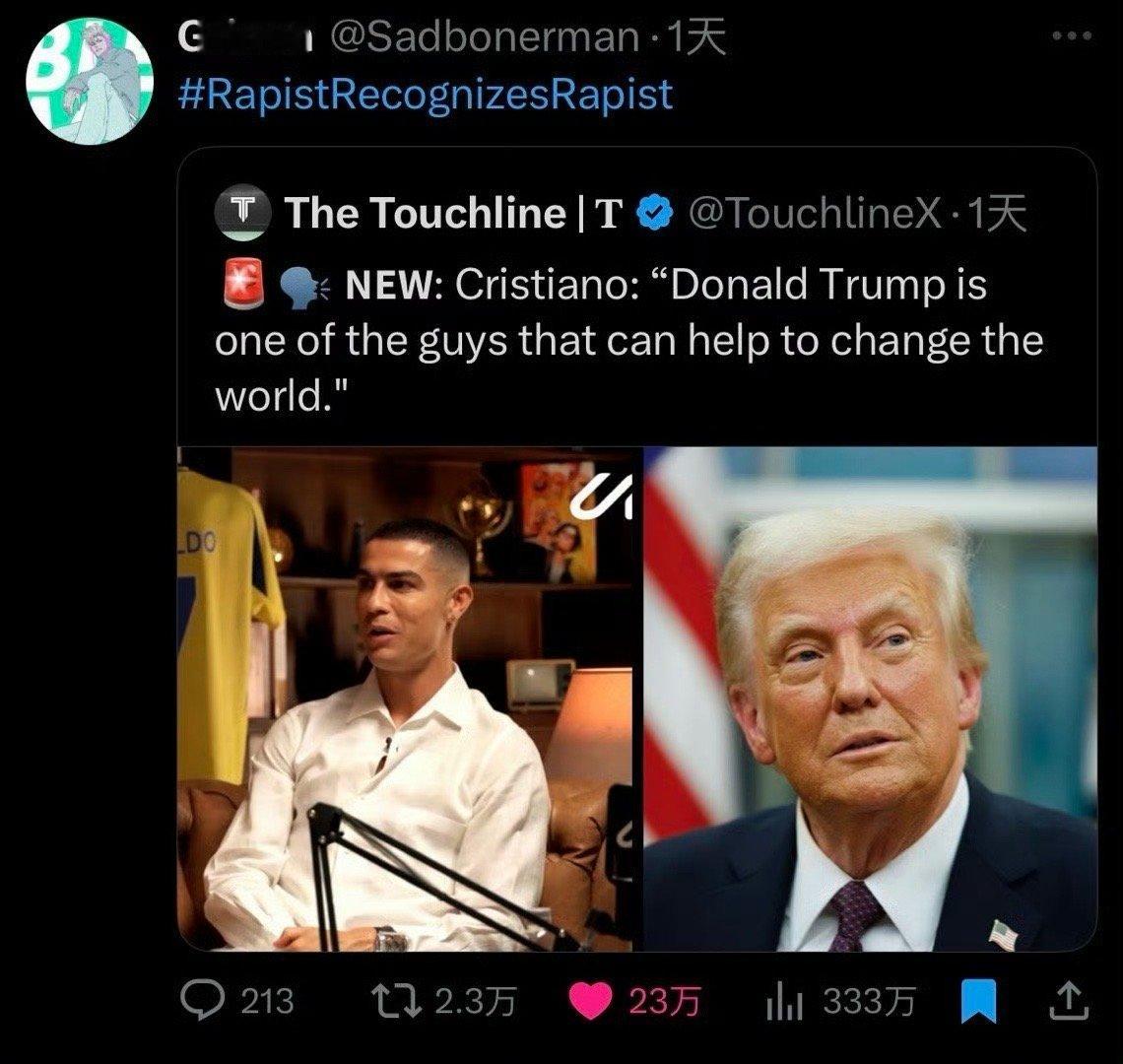 不是…怎么这都能Cue到球王啊…梅西被授予“美国自由总统勋章”,老梅因为不喜欢与政治打交道,没有出席在白宫举行的颁奖仪式,是全场唯一缺席的。而C罗不过是跟着沙特代表团,参与一次普通晚宴,这都能踩一脚球王,罗粉是没见过世面吗?!对了,川普也没说GOAT那段,是外网知名谣棍粉头编造的并被某些媒体误传(且已删),内外一个样啊 再说和川普扯上关系是什么值得骄傲的事情吗?推上高赞关于C罗和特朗普之间的关系:“Rapist Recognizes Rapist”