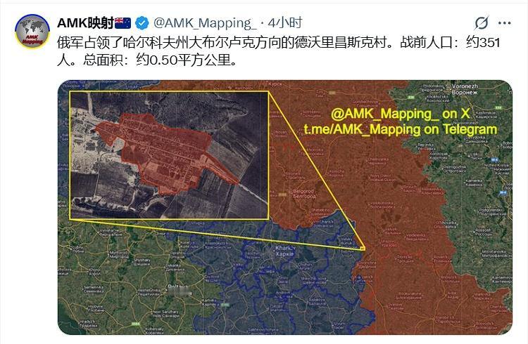 大洋洲信源承认,俄军占领了 维塞勒(图1、图2)、海村(图3、图4)、普拉托诺夫卡(图5、图6)以及 德沃里昌斯克(图7、图8)。 俄乌局势新进展 烽火问鼎计划 海外新鲜事