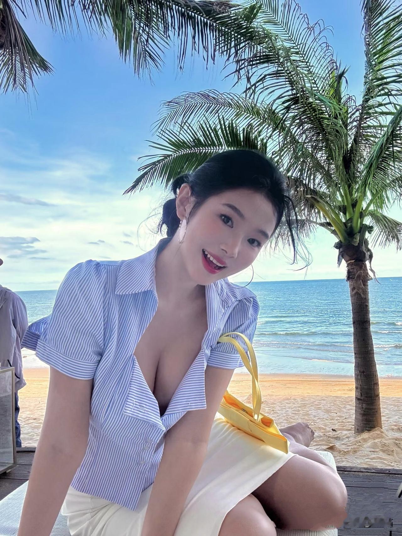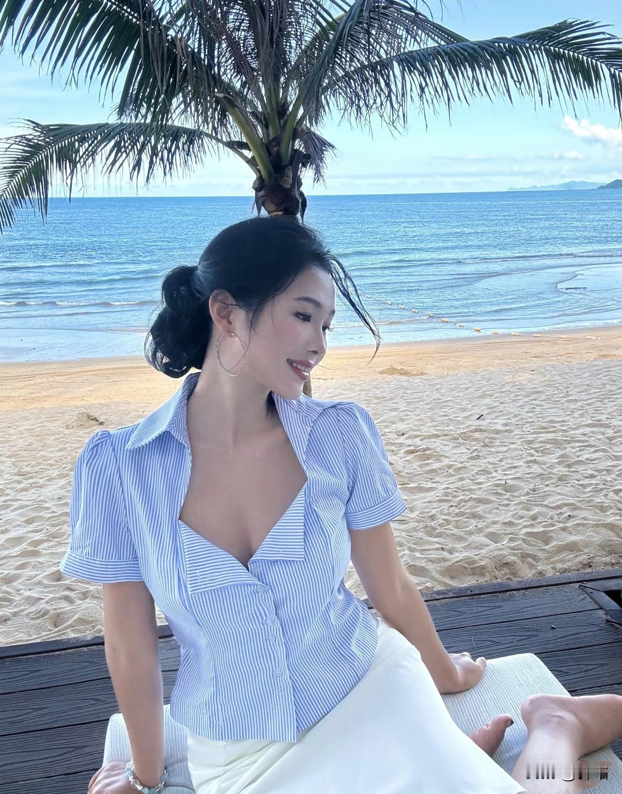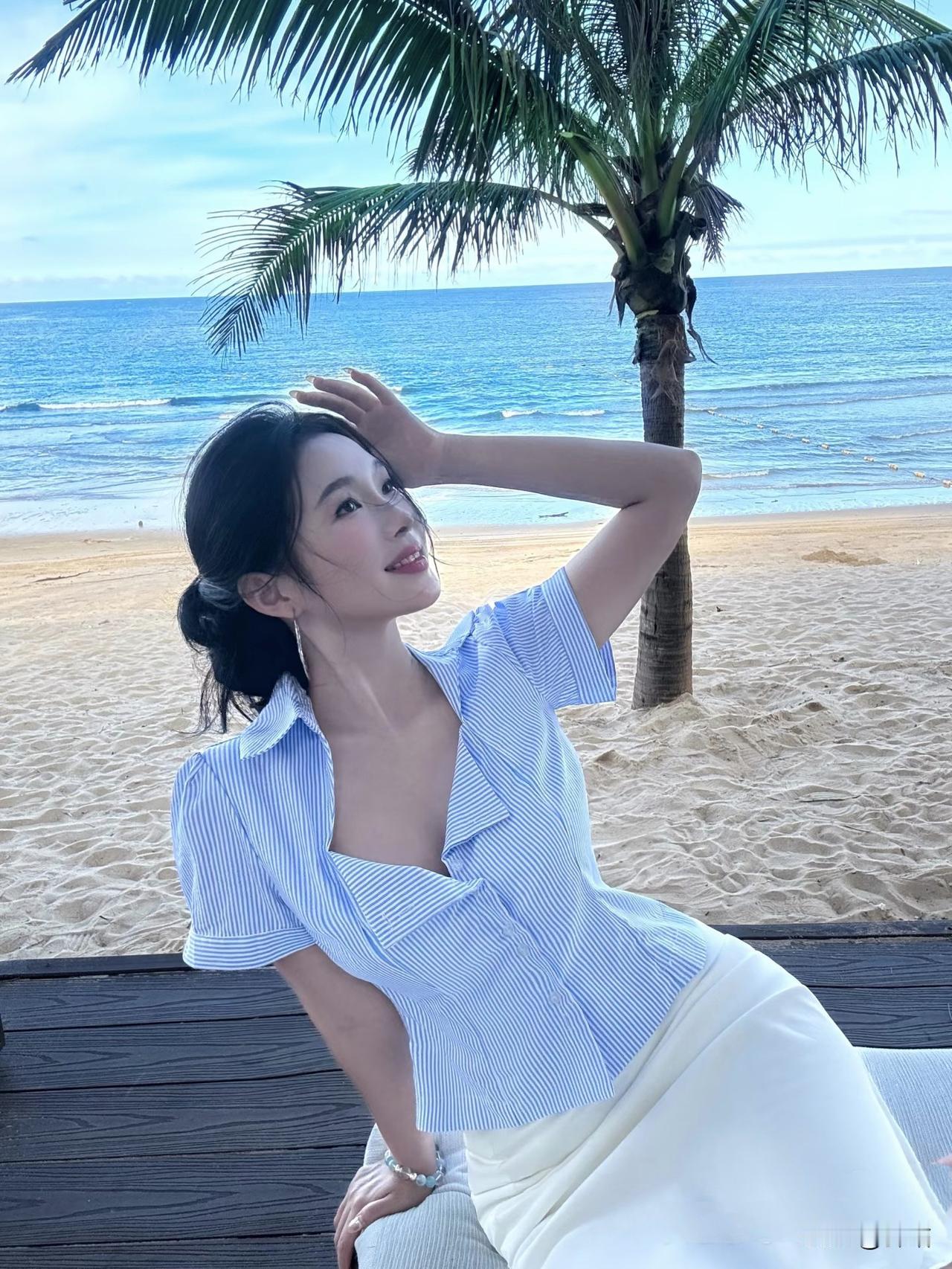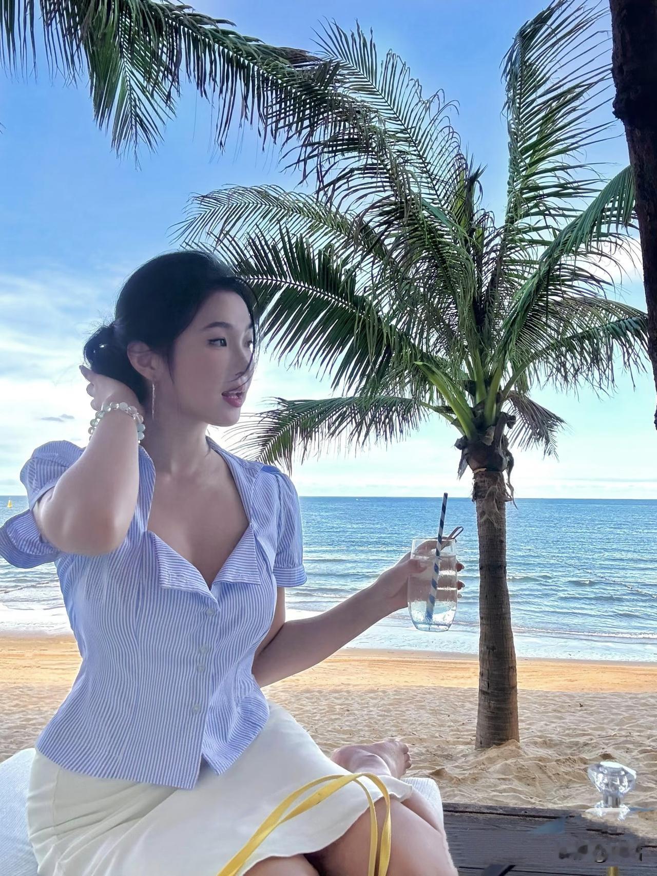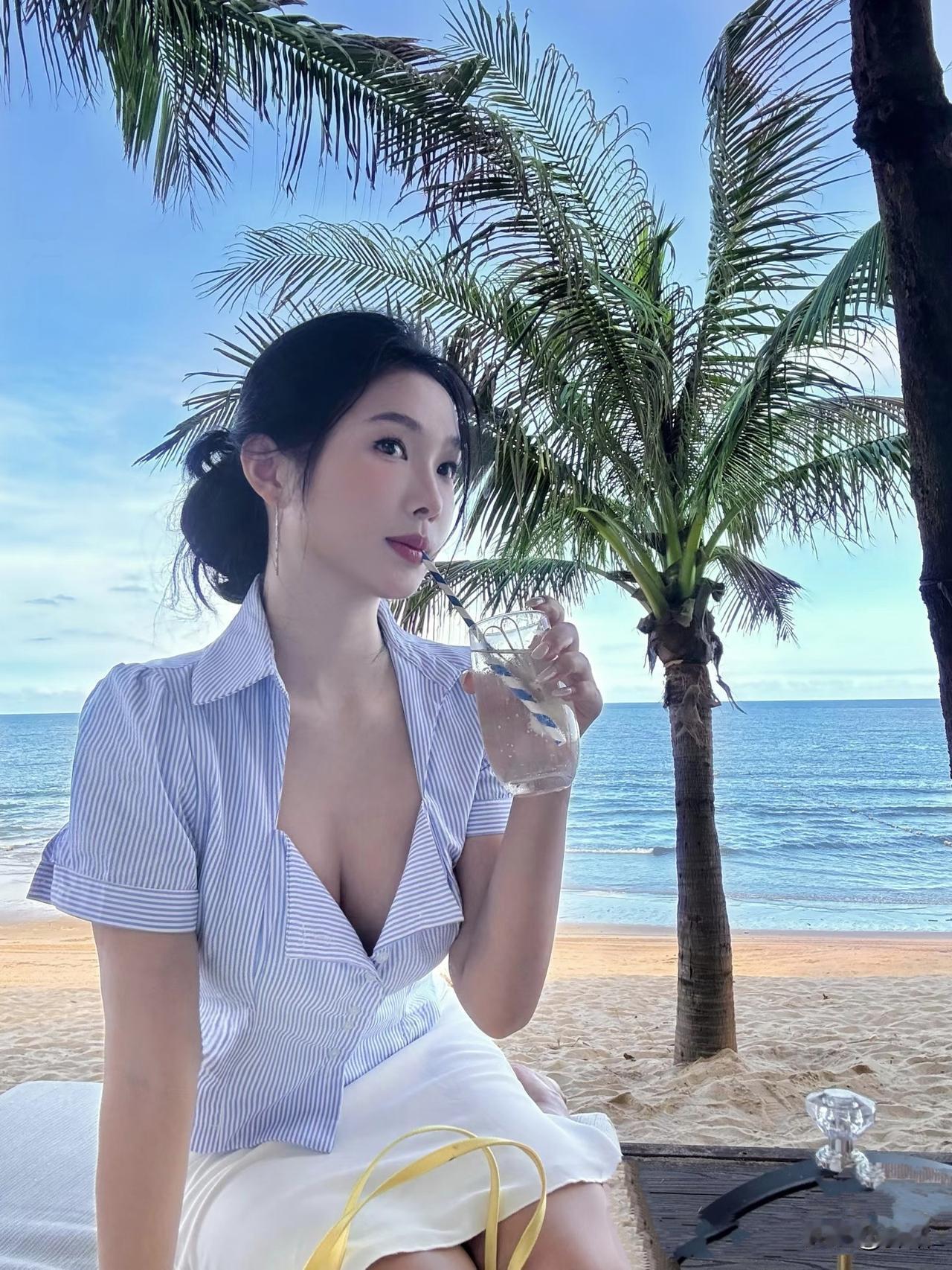 美图欣赏,看图写诗 《夏日海滩》 椰枝摇碎晴光暖,浪色铺成碧海长。 懒把冰饮簪鬓角,风捎夏意入衣裳。 《海边的蓝白衫》 椰叶把云剪得很薄, 风从领口溜进来时, 海浪正对沙滩低吟。 冰饮的水珠洇湿指节, 发梢沾着半缕咸意, 你抬眼的瞬间, 夏天就成了蓝白相间的褶皱。 图片来源于网络
