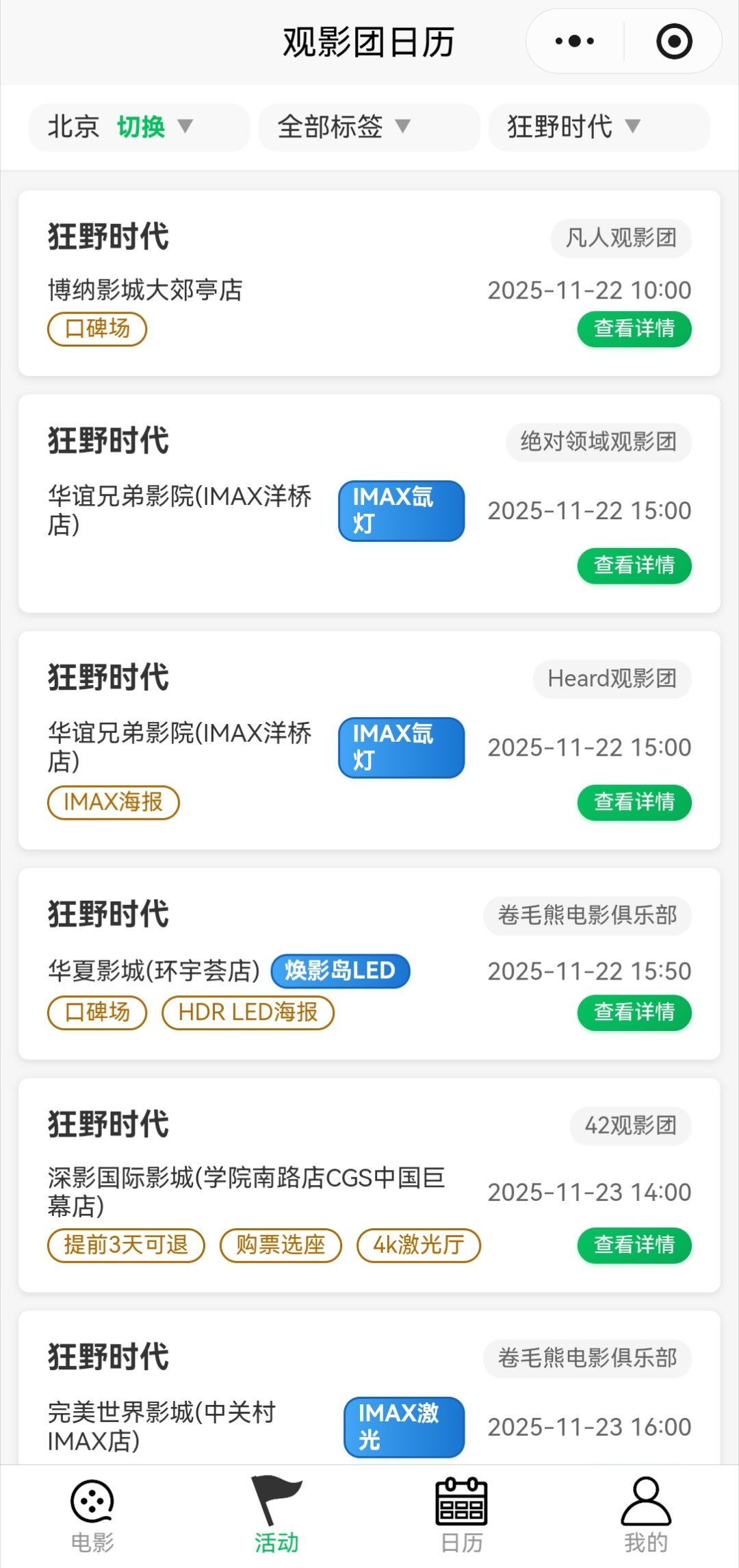 大家可以关注一下【观影团日历】小程序,随时查看狂野时代各类观影团活动。