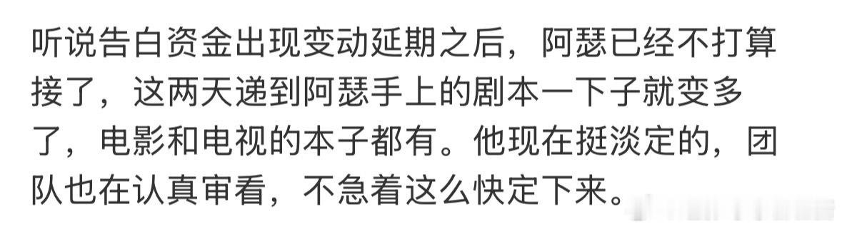 网传称告白因资金问题延期停拍了,且陈飞宇也不演了,阿瑟现在手里有很多电影和电视的本子,团队在慢慢挑选🤔🤔🤔那告白到王星越手里了吗