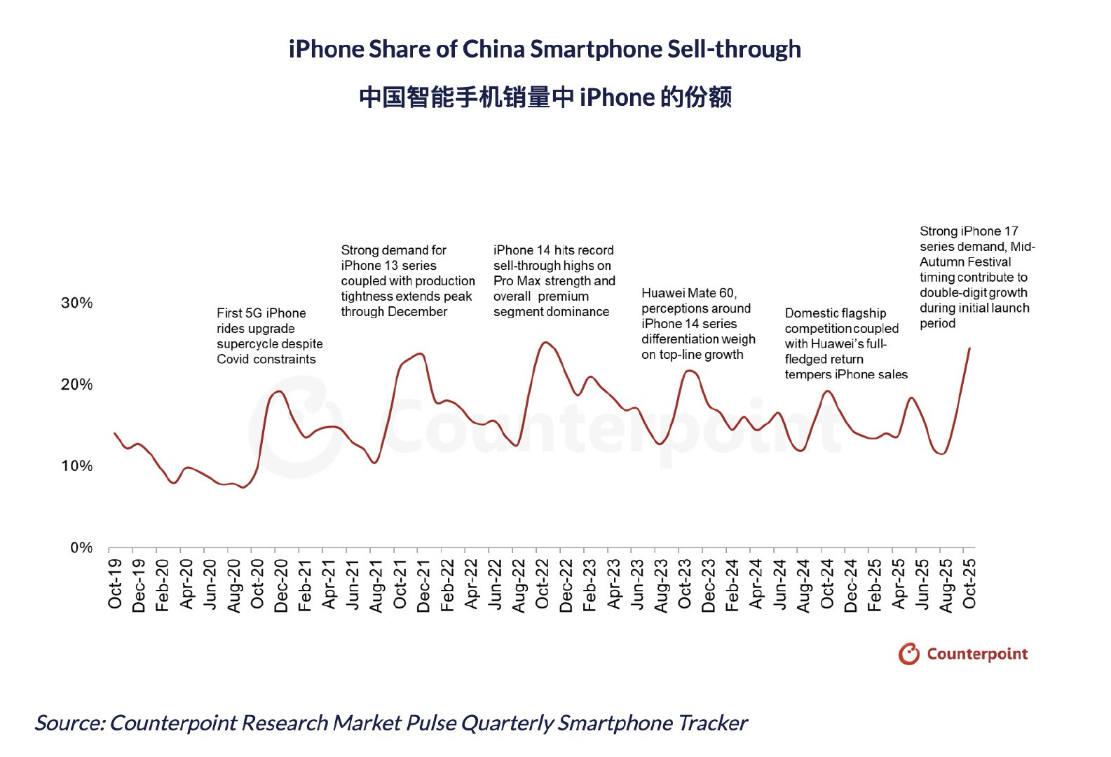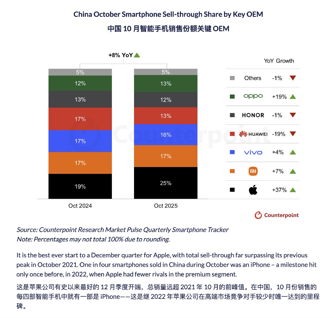 Counterpointre Rearch:中国10 月份销售的每四部智能手机中就有一部是 iPhone。Counterpoint Research 强调这是苹果有史以来最好的 12 月季度开端,总销量远超 2021 年 10 月的前峰值。中国智能手机销量在 10 月份增长了 8%,主要受苹果 37%的同比增长推动。我想,原因大家都很清楚~