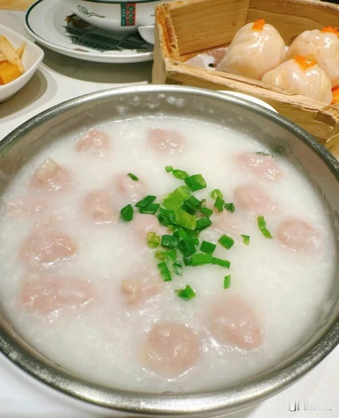 今天早餐吃什么:闻名鼓手肉丸粥,白灼菜心,香煎牛肉煎饼 ,脆皮春卷,功夫大虾饺!