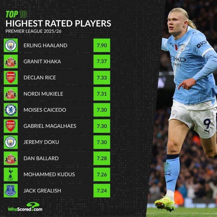 WhoScored本赛季英超球员评分榜:1、哈兰德(曼城):7.902、扎卡(桑德兰):7.373、赖斯(阿森纳):7.334、穆基勒(桑德兰):7.315、凯塞多(切尔西):7.30加布里埃尔(阿森纳):7.30多库(曼城):7.308、巴拉德(桑德兰):7.289、库杜斯(热刺):7.2610、格拉利什(埃弗顿):7.24