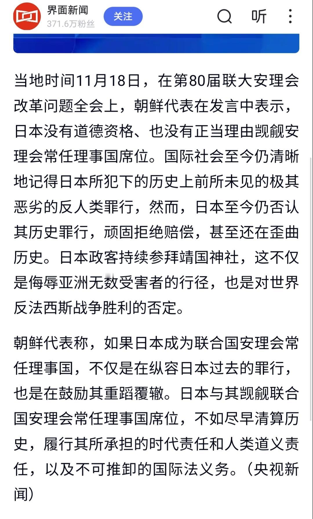 朝鲜代表:日本没道德资格,也没有正当理由觊觎安理会常任理事国席位。 当地时间11月18日,在第80届联大安理会改革问题全会上,朝鲜代表发言指责日本,没有道德资格,也没有正当理由觊觎安理会常任理事国席位。 朝鲜代表列出理由是,日本侵略历史犯下极其恶劣的反人类罪,还否认历史罪行、歪曲侵略历史实事、参拜靖国神社等,这是对受害者的不尊重,也是对世界反法西斯战争胜利的否定。 朝鲜代表还说,如果让日本成为安理会常任理事国是纵容日本过去所犯的历史罪行,鼓励其重蹈覆辙。并呼吁日本与其要岂觊觎联合国安理会常任理事国,不如尽早清算历史,承担相应的责任及义务等。 难得朝鲜代表能公开仗义执言,不仅痛批日本侵略历史的罪行,还指责日本不反省侵略历史给亚洲各国造成的伤害、不承认历史错误,还歪曲历史事实等恶劣行为。在日本没彻底反省侵略历史并承认错误,承担相应历史责任的情况下,必须坚决反对日本成为安理会常任理事国,这既对受害者的尊重,也是对历史的尊重。