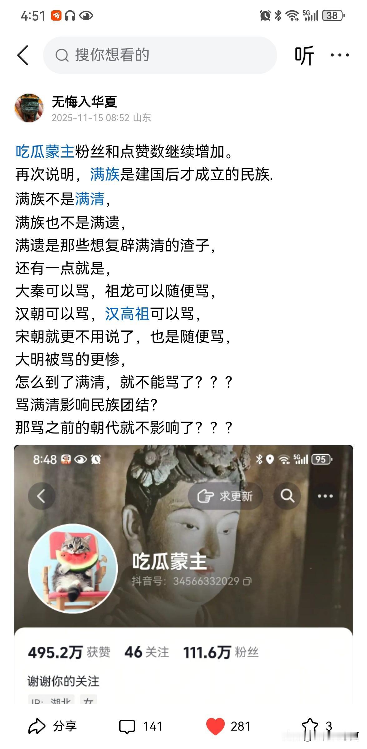 四天过去, 吃瓜蒙主的粉丝数量从111万迅速涨到125万,涨了9万粉丝,这还是在其本人不直播不发视频,清空之前视频的情况下。 感谢各路螨遗,黑子,水军的贡献。 希望你们不要停,继续往死里黑蒙主,感谢!