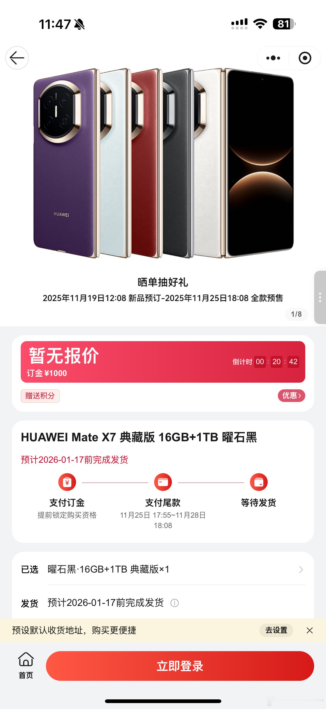 华为mate x7现在预定26年1月17号前才能发货发货到再2-3天这有点太久了吧....