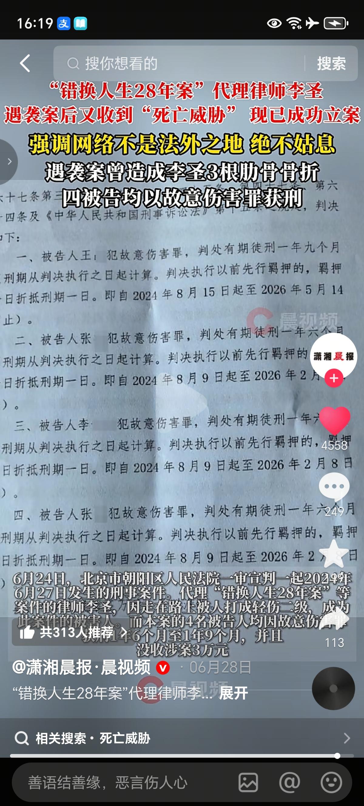 一直以为律师的职业很安全,像李圣律师这样普遍被大家最重的律师更安全,没想到还会被打断肋骨,甚至闯进他家里打人,就因为一个在医院抱错孩子的事情。他和他代理的许女士都认为孩子是被故意抱错的。医院都赔偿了,事情还没完事。 如果两个孩子都没好好的,许女士也不会太追究,主要是她当成是亲儿子的孩子因为错抱得事情错过了最佳的打乙肝疫苗机会,最后因为肝癌失去了年轻的生命。如果孩子们是故意抱错的,那就是孩子的亲生母亲杜新枝隐瞒乙肝病史。 许敏都要把自己的肝捐给儿子了,结果没有血缘关系,无能为力。没想到李律师会因为这个被打。