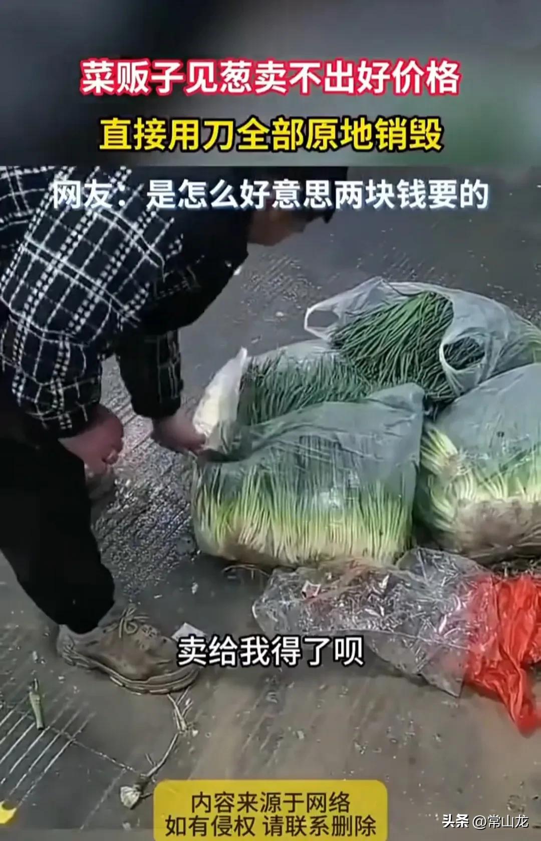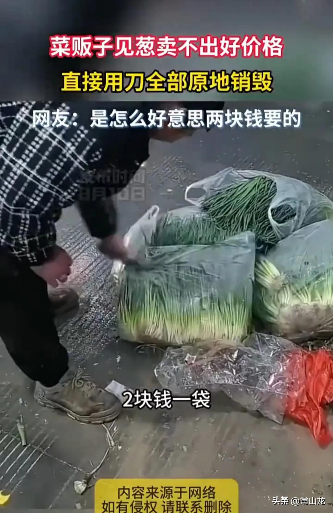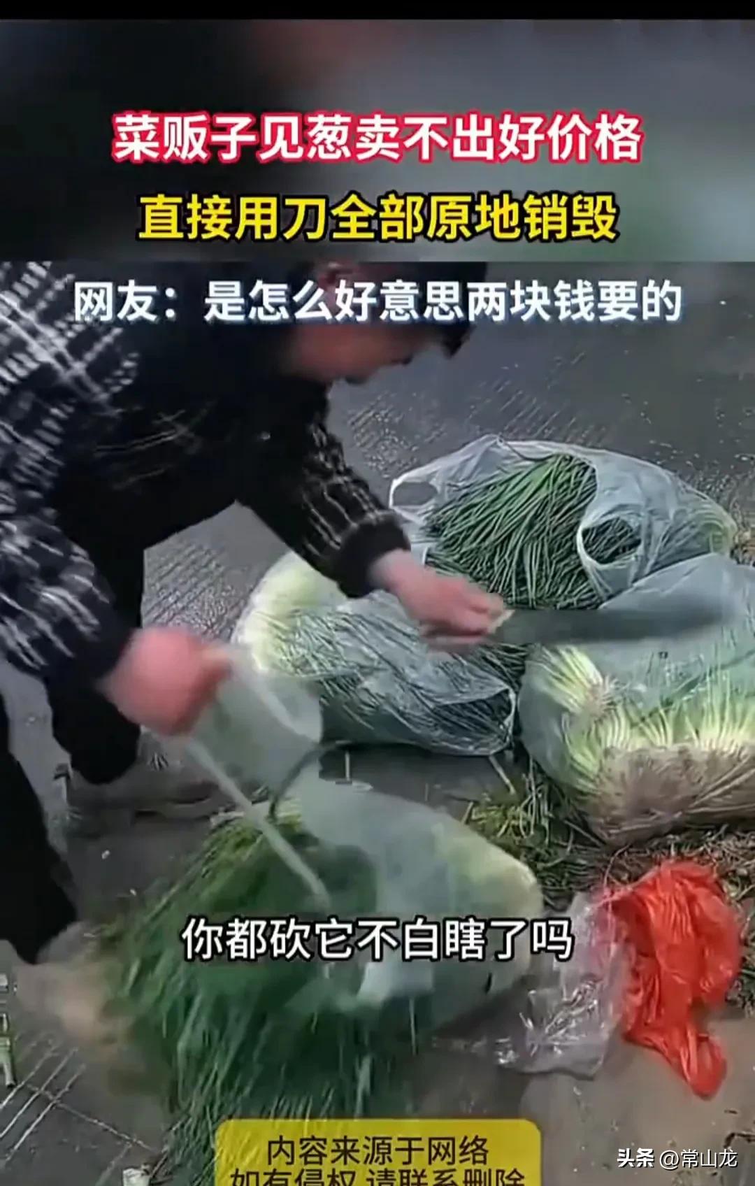 男子一直守到傍晚收摊,几袋小葱都卖不出去,他已经是贱卖了,这么一大袋只要5元,可以说亏到姥姥家了,可顾客还是嫌贵,只愿出两元,明显就是趁人之危,要白嫖啊。 想着天色已晚,男子卖不掉也不会再拿回去,最终只有妥协,到时候自己就能捡个大便宜了。 “两块钱,我宁可扔掉都不会卖,”男子怒从心㡳起,拿起一把锋利的水果刀,将小葱连着袋子来回斩烂,彻底销毁。 等着白嫖的人傻眼了:“两块钱一袋卖给我得了,你都砍它不白瞎了吗。” “少了5块钱不卖。” “折腾折腾得了,还全砍了,白瞎了不是,这两块钱不是钱吗?” 都说谷贱伤农,这就是活生生的例子,5块钱这么一大袋,10斤都不止,已经相当便宜了,可还是有人嫌贵,人心不足蛇吞象啊。 有网友说,这跟以前课本上学的,美国经济危机时,生产相对过剩,资本家宁可将牛奶白白倒掉,也不让贫民喝有异曲同工之妙。 这能一样吗?根本就不一样。 小贩不是资本家,顾客也不是贫民,他不是没钱买,他明显就是想占便宜,这算什么贫民,说他是刁民都不为过。 资本家将牛奶倒掉,更多的还是经济上的考量,牛奶送到超市要灭菌、要罐装,还要出运费,林林总总的费用加起来比售价还高,他卖掉可能还亏得更多,所以只能白白倒掉了。 而在这里,男子的成本已经事实上付出了,他只有卖掉才能减少损失,能卖一文是一文,砍了就一分都没有了,他这种行为就是置气,有点冲动了。