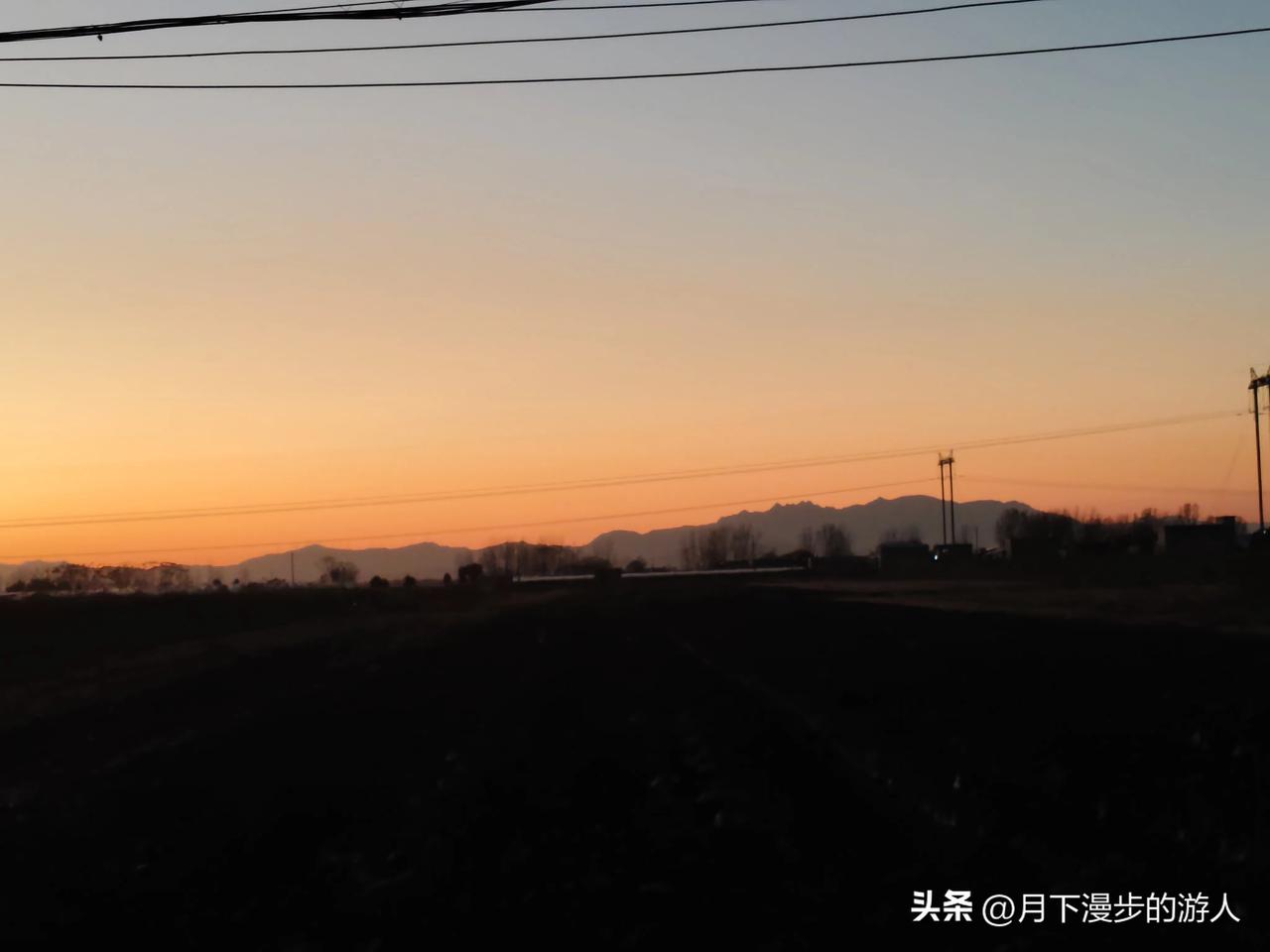 今天开着车路过这片田野,一抬头撞见这日落,直接看愣了。 天边从橘红往浅蓝褪,远处山头像蒙了层灰纱,电线杆子和电线在光里拉出细影子,底下的地黑乎乎的,像是刚耕过。 风裹着点土腥味吹过来,明明是常见的乡下景,偏偏这日落把啥都衬得软乎乎的。 突然觉得这日子也挺好,不用啥大风景,随便一抬眼,就能接住这么温柔的傍晚。 要不要我帮你写段更细腻的描写,把这感觉再揉碎点?