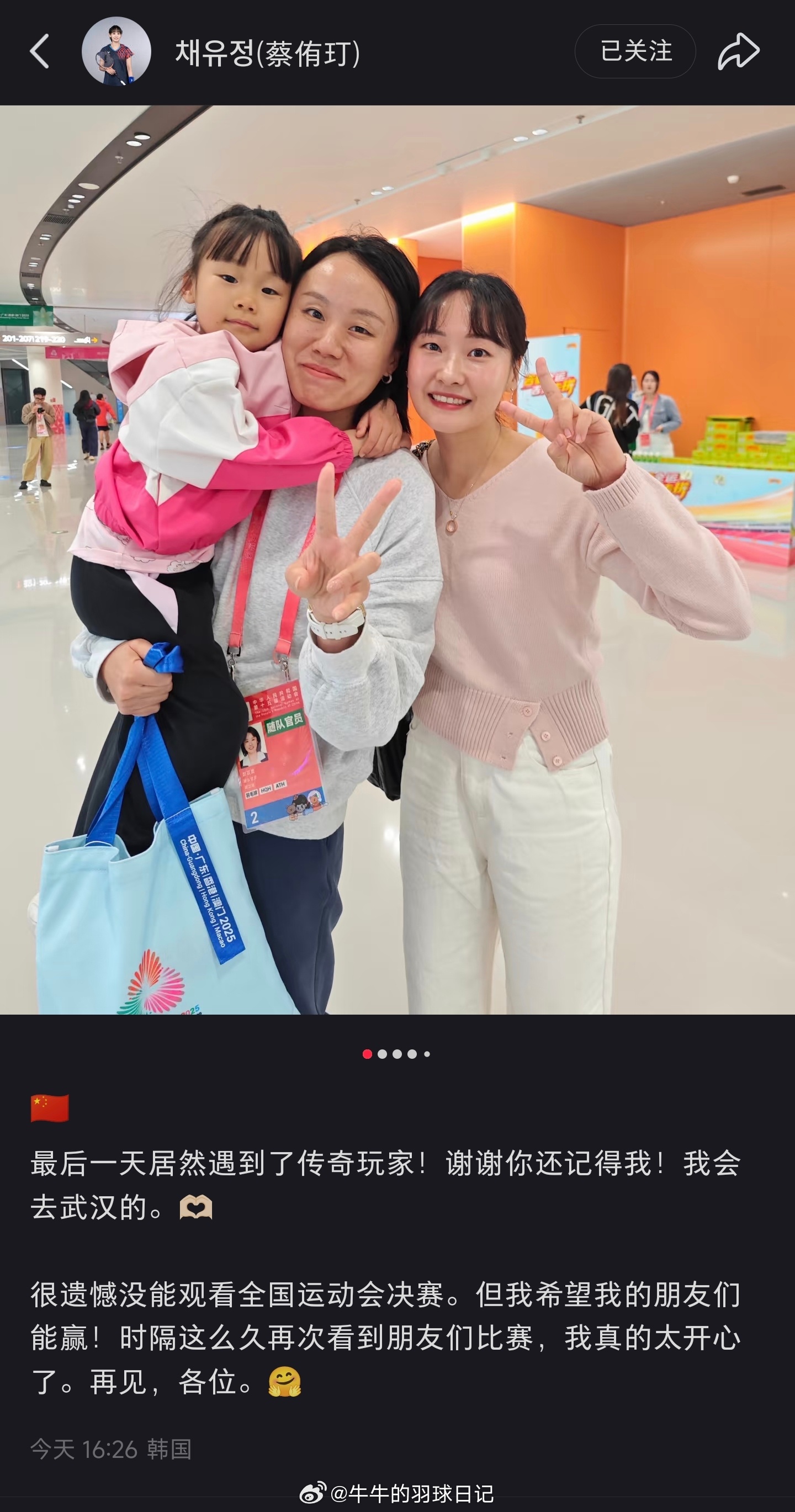 蔡姐的全运之旅:最后一天居然遇到了传奇玩家!谢谢你还记得我!我会去武汉的。🫶🏻很遗憾没能观看全国运动会决赛。但我希望我的朋友们能赢!时隔这么久再次看到朋友们比赛,我真的太开心了。再见,各位。🤗