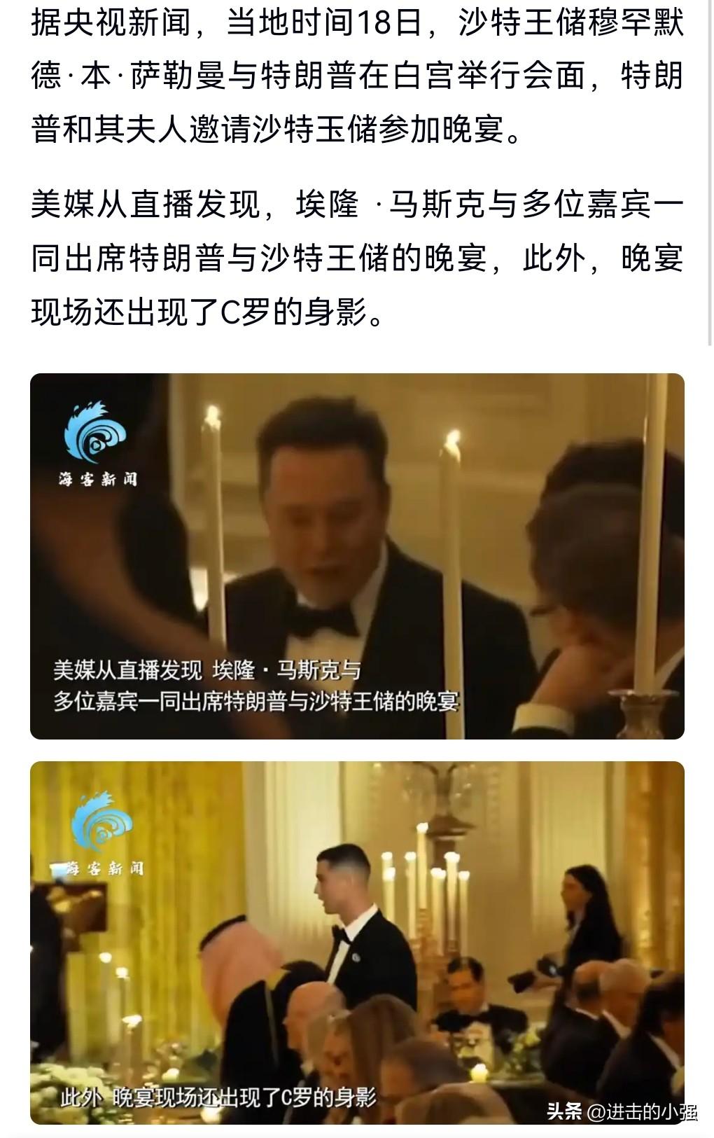 看来历史就是一个回旋镖啊。 C罗、马斯克现身白宫,出席特朗普晚宴。 你敢想吗?你敢信吗?此前马斯克和特朗普闹得那么僵。 没想到这次还出席了特朗普的晚宴。 也是可以理解的,毕竟有利益的地方就有合作。