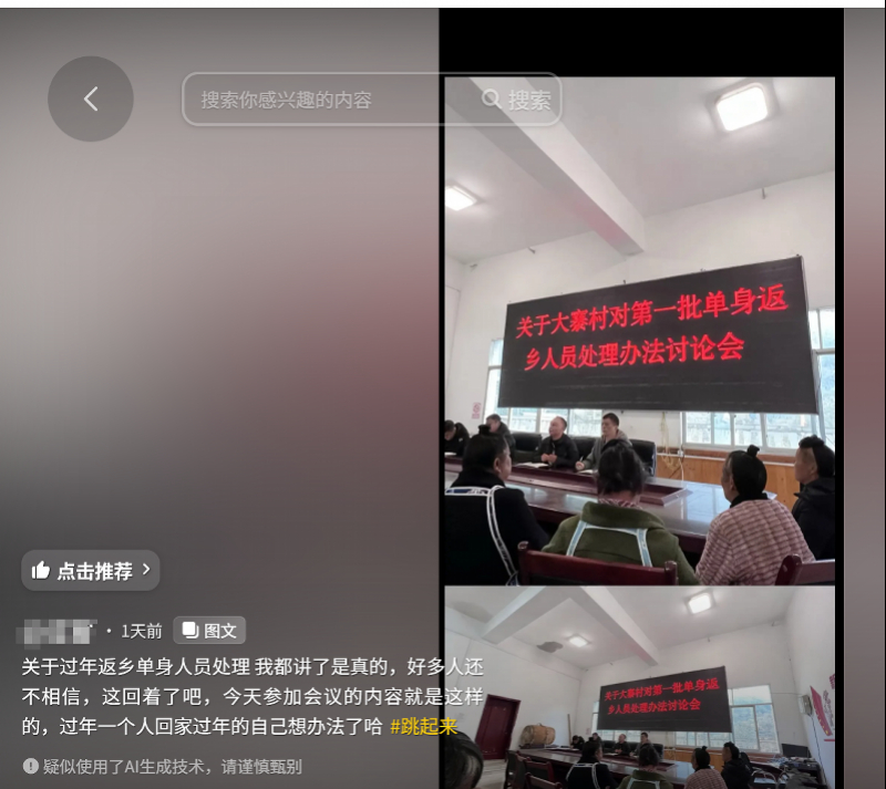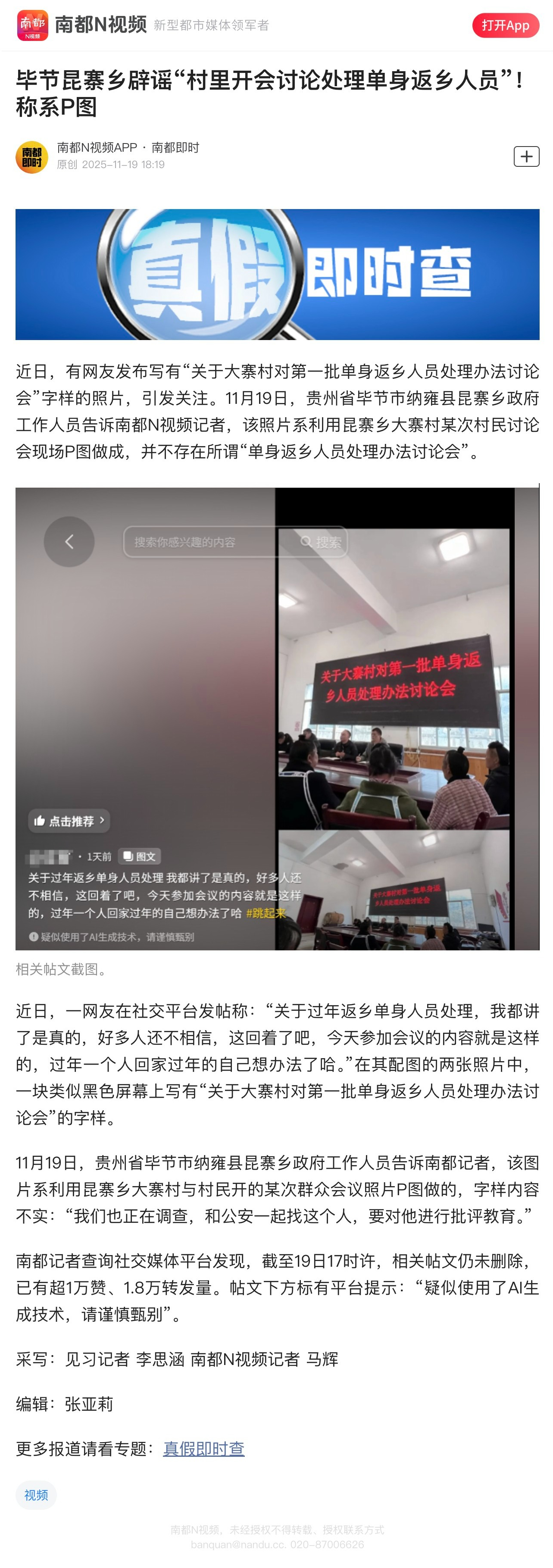 【毕节昆寨乡辟谣“村里开会讨论处理单身返乡人员”!称系P图】近日,有网友发布写有“关于大寨村对第一批单身返乡人员处理办法讨论会”字样的照片,引发关注。11月19日,贵州省毕节市纳雍县昆寨乡政府工作人员告诉南都N视频记者,该照片系利用昆寨乡大寨村某次村民讨论会现场P图做成,并不存在所谓“单身返乡人员处理办法讨论会”。“我们也正在调查,和公安一起找这个人,要对他进行批评教育。”南都记者查询社交媒体平台发现,截至19日17时许,相关帖文仍未删除,已有超1万赞、1.8万转发量。帖文下方标有平台提示:“疑似使用了AI生成技术,请谨慎甄别”。南都N视频记者 马辉 见习记者 李思涵