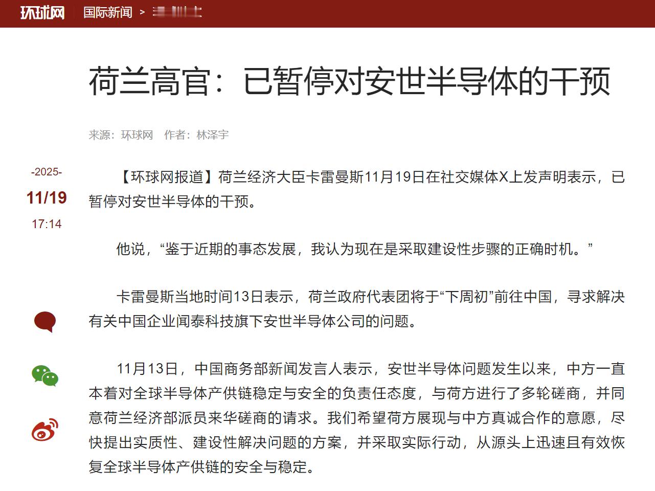 【 】据环球网, 荷兰经济大臣卡雷曼斯11月19日在社交媒体X上发声明表示,已暂停对安世半导体的干预。他说,“鉴于近期的事态发展,我认为现在是采取建设性步骤的正确时机。”卡雷曼斯当地时间13日表示,荷兰政府代表团将于“下周初”前往中国,寻求解决有关中国企业闻泰科技旗下安世半导体公司的问题。