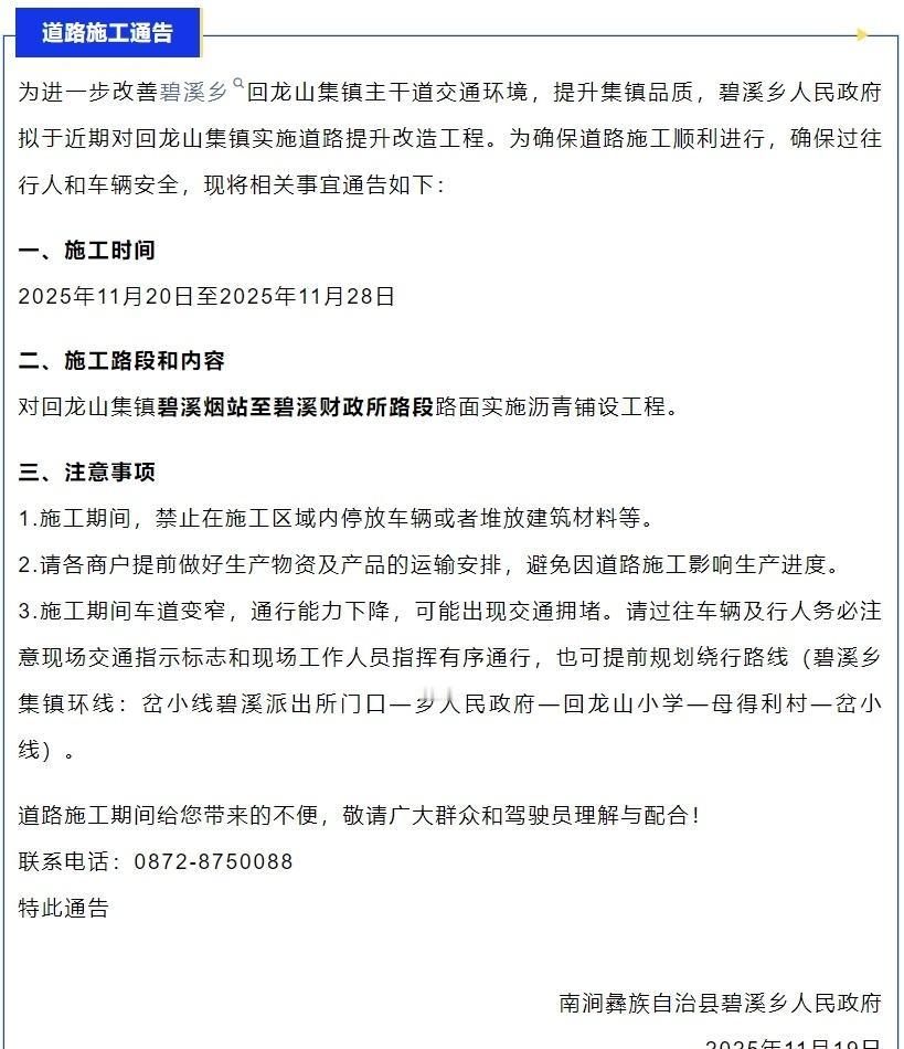 【道路施工 | 碧溪乡回龙山集镇(岔小线)道路施工通告】