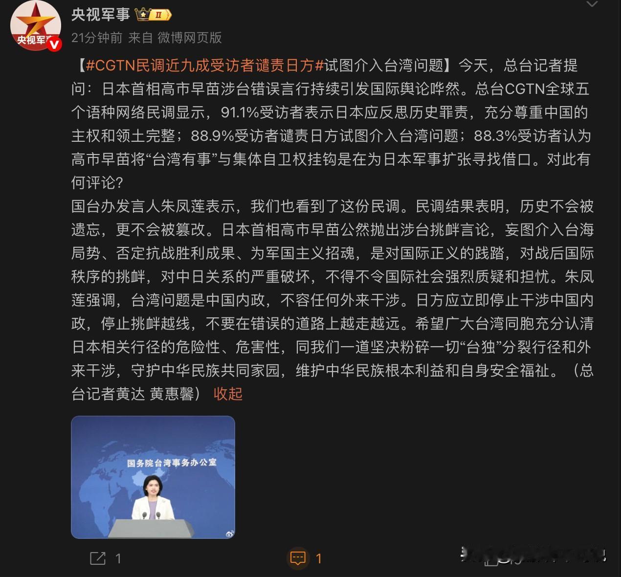 高市错误言论又迎来新的声讨,民调显示搞事是要遭秒的!《央视军事》今天发布了CGTN全球五种语言的网络民调。超过91%的受访者认为日本应该反思历史罪责,充分尊重我国的主权和领土完整;88.9%的民众谴责日方试图介入台湾问题;更有88.3%的受访者认为高市的错误言论是在为日本军事扩张寻找借口。由此可见,群众的眼睛是雪亮的,小日本的企图就是司马昭之心!联想到昨天中日会谈没取得满意成果的情况,咱们的反制手段又发生了新的变化,比如《北京日报》起底甲午海战时的日本间谍网、叫停中日友好纪念活动,还有上述所说的全球民意大调查。这次民意调查充分说明了,日本的错误言行不得人心。我个人猜测,这是不是在释放某种信号,为下一步反制作民意铺垫?!
