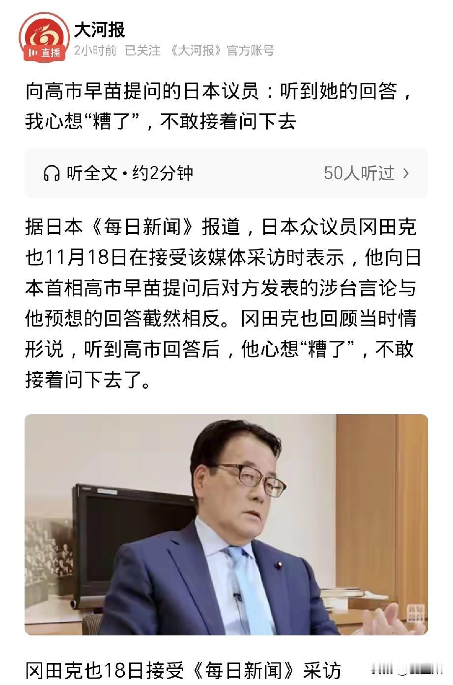 在11月7日, 提问高市早苗的那位众议员接受记者采访时已经坦白: 作为首相,那段