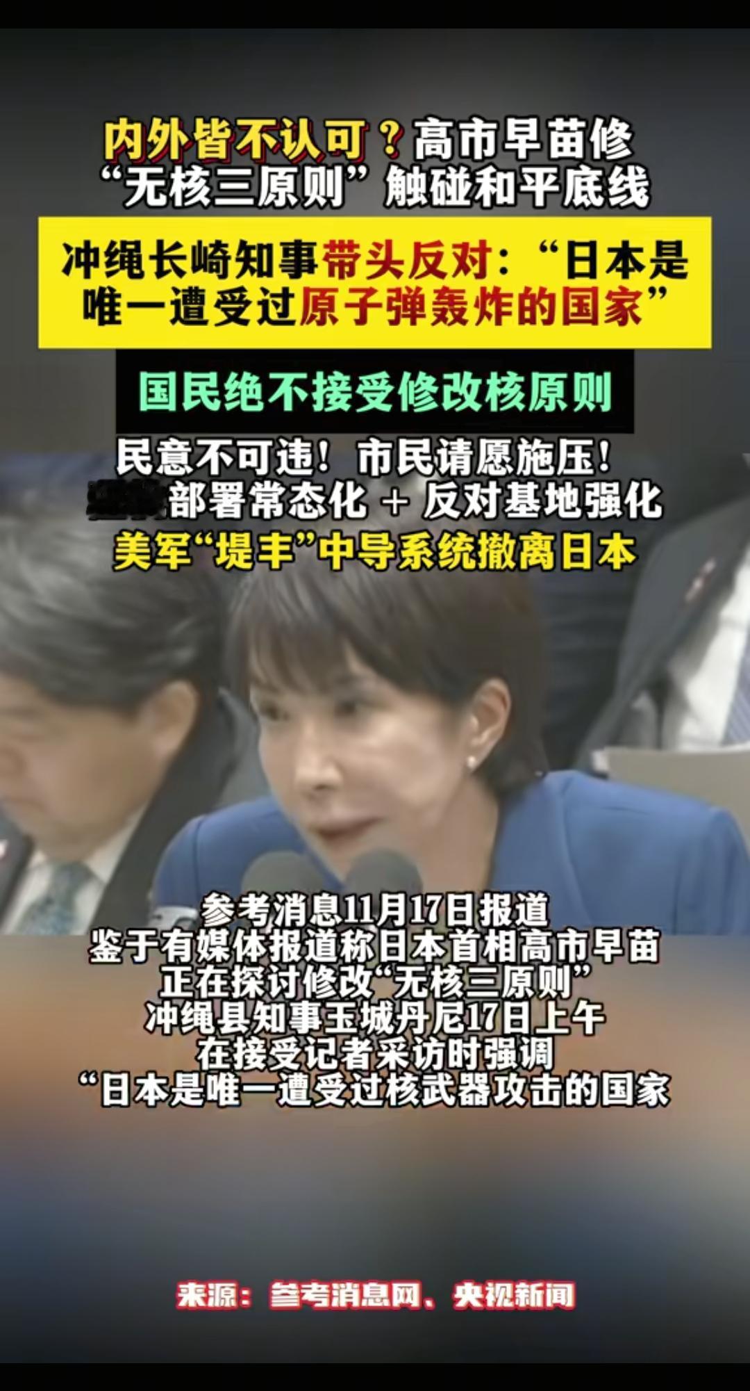 高市早苗竟然想拥有核武器! 作为唯一挨过核弹的国家,日本过去一直秉持“不拥有、不制造、不引进”的无核三原则,可右翼首相高市早苗偏要蹬鼻子上脸,公然计划修改“不引进”条款,为美军核武进驻日本铺路,美其名曰“强化核威慑”。 她的倒行逆施早在日本炸了锅:广岛、长崎、冲绳知事集体怒怼,直言“完全不可接受”;前首相岸田文雄、防卫大臣小泉都与之公开唱反调,自民党内部更是骂声一片。 更讽刺的是,这原则是日本当年拿诺贝尔和平奖的资本,如今高市非要撕毁体面,倒逼周边国家警惕。手里攥着能造6000枚核弹的钚,还想抱美军核大腿,这哪是求安全?分明就是想重走军国主义道路。日本核武争议