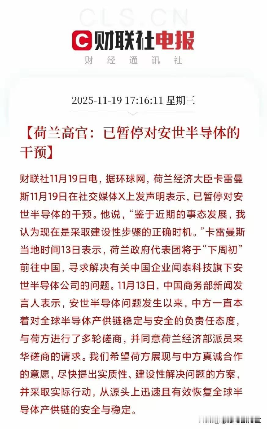 重大好消息! 突发重磅利好!荷兰正式宣布,暂停对安世半导体干预,闻泰科技危机解除!受益公司速看! 刚刚,荷兰经济大臣卡雷曼斯,在社交媒体上发布重大声明:已暂停对安世半导体的干预!这场持续数月的半导体危机,终于迎来重大转机! 两大大利好: 1. 供应链稳定性,大幅提升 安世半导体作为全球领先的功率半导体企业,其正常运营对汽车电子、工业控制等领域至关重要。这次危机解除,将有效保障全球半导体供应链的稳定性,特别是汽车芯片供应,将得到有力保障! 2. 闻泰科技,价值重估 随着安世半导体危机解除,闻泰科技将彻底摆脱此前的阴霾。作为A股半导体板块的重要标的,公司估值有望快速修复,重新获得资金的青睐! 产业链影响深远: 1. 汽车芯片受益明显 安世半导体是全球汽车功率半导体的核心供应商,此次危机解除,将直接利好新能源汽车产业链。从整车制造到零部件企业,都将受益于芯片供应的稳定保障! 2. 半导体设备迎来机遇 半导体合作关系的改善,国内半导体设备企业,有望获得更多国际合作机会。特别是在成熟制程领域,技术交流与合作,将更加顺畅! 受益方向: 功率半导体:闻泰科技、斯达半导 汽车芯片:比亚迪半导体、时代电气 半导体设备:中微公司、北方华创 坐稳扶好!这次的态度转变,不仅是个股利好,也是全球半导体产业链,走向合作共赢的重要信号。在人工智能和新能源汽车,共同推动下,半导体板块,有望开启新一轮上涨行情!接下来,我们不妨深入探讨一下这些受益公司将如何在这一利好局势下大展拳脚。 闻泰科技作为此次危机解除的直接受益者,有望凭借安世半导体的稳定运营,进一步巩固其在功率半导体领域的地位。公司在汽车电子等多个领域的布局将更加顺畅,可能会加大研发投入,推出更多具有竞争力的产品,从而提升市场份额。而斯达半导也将借助行业的东风,充分发挥自身优势,与上下游企业展开更广泛的合作,实现业绩的稳步增长。 在汽车芯片方面,比亚迪半导体和时代电气将迎来新的发展契机。稳定的芯片供应将助力比亚迪汽车进一步提升产品的品质和性能,推动新能源汽车的销量再创新高。时代电气也能够凭借其在轨道交通和新能源汽车领域的技术积累,在芯片供应稳定的背景下,开拓更多的市场空间。 对于半导体设备企业中微公司和北方华创而言,国际合作机会的增加将加速其技术的迭代升级。它们可以与国际先进企业共同研发新技术、新设备,提高自身的核心竞争力。在研发过程中,还可能会培养出一批优秀的技术人才,为我国半导体产业的长远发展奠定坚实基础。 投资者们可以密切关注这些受益公司的动态,把握投资机会。不过,市场情况变幻莫测,在投资时也需保持理性,充分考虑各种风险因素。相信在全球半导体产业链走向合作共赢的大趋势下,相关企业将迎来更加美好的未来,半导体板块的新一轮上涨行情值得我们拭目以待!